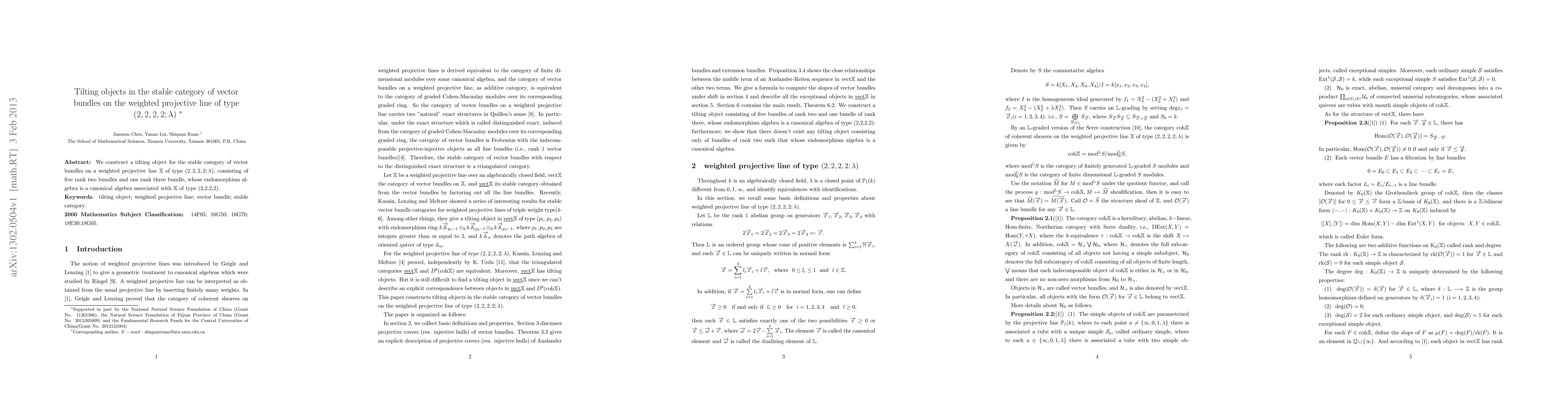 Summary: This paper constructs a tilting object in the stable category of vector bundles on a weighted projective line of type (2,2,2,2;λ), featuring five rank two bundles and one rank three bundle, with its endomorphism algebra being a canonical algebra associated with the line.