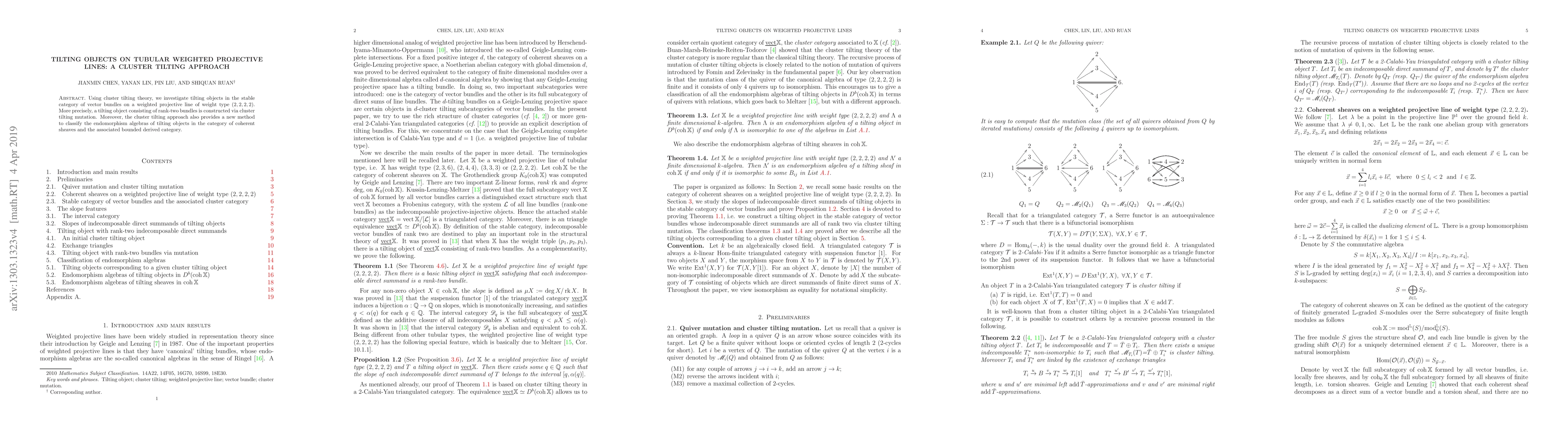 Summary: This paper utilizes cluster tilting theory to construct and classify tilting objects in the stable category of vector bundles on a specific weighted projective line, employing cluster tilting mutation for the construction and providing a new method for classifying their endomorphism algebras.