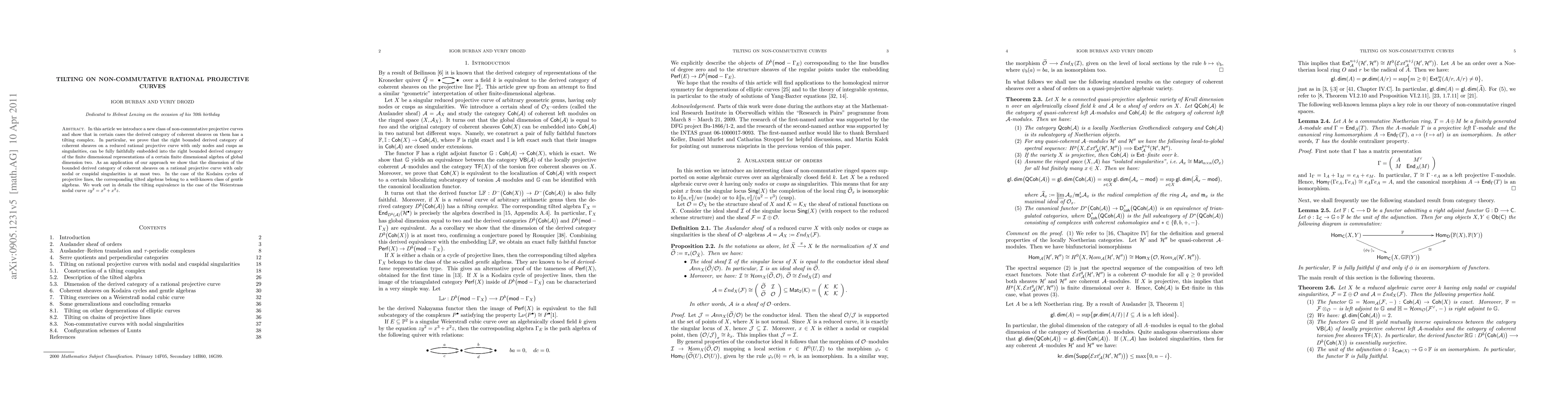 In this article we introduce a new class of non-commutative projective curves and show that in certain cases the derived category of coherent sheaves on them has a tilting complex. In particular, we prove that the right bounded derived category of coherent sheaves on a reduced rational projective curve with only nodes and cusps as singularities, can be fully faithfully embedded into the right bounded derived category of the finite dimensional representations of a certain finite dimensional algebra of global dimension two. As an application of our approach we show the dimension of the bounded derived category of coherent sheaves on a rational projective curve with only nodal or cuspidal singularities is at most two. In the case of the Kodaira cycles of projective lines, the corresponding tilted algebras belong to a well-known class of gentle algebras. We work out in details the tilting equivalence in the case of the plane nodal cubic.