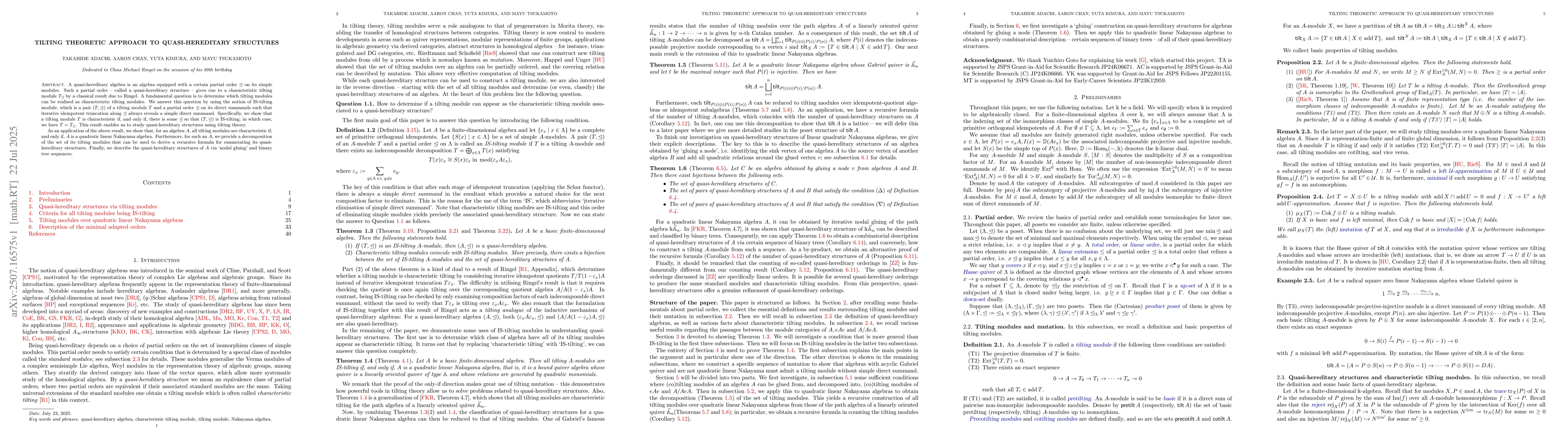A quasi-hereditary algebra is an algebra equipped with a certain partial order $\unlhd$ on its simple modules. Such a partial order -- called a quasi-hereditary structure -- gives rise to a characteristic tilting module $T_{\unlhd}$ by a classical result due to Ringel. A fundamental question is to determine which tilting modules can be realised as characteristic tilting modules. We answer this question by using the notion of IS-tilting module, which is a pair $(T,\unlhd)$ of a tilting module $T$ and a partial order $\unlhd$ on its direct summands such that iterative idempotent truncation along $\unlhd$ always reveals a simple direct summand. Specifically, we show that a tilting module $T$ is characteristic if, and only if, there is some $\unlhd$ so that $(T,\unlhd)$ is IS-tilting; in which case, we have $T=T_{\unlhd}$. This result enables us to study quasi-hereditary structures using tilting theory. As an application of the above result, we show that, for an algebra $A$, all tilting modules are characteristic if, and only if, $A$ is a quadratic linear Nakayama algebra. Furthermore, for such an $A$, we provide a decomposition of the set of its tilting modules that can be used to derive a recursive formula for enumerating its quasi-hereditary structures. Finally, we describe the quasi-hereditary structures of $A$ via `nodal gluing' and binary tree sequences.