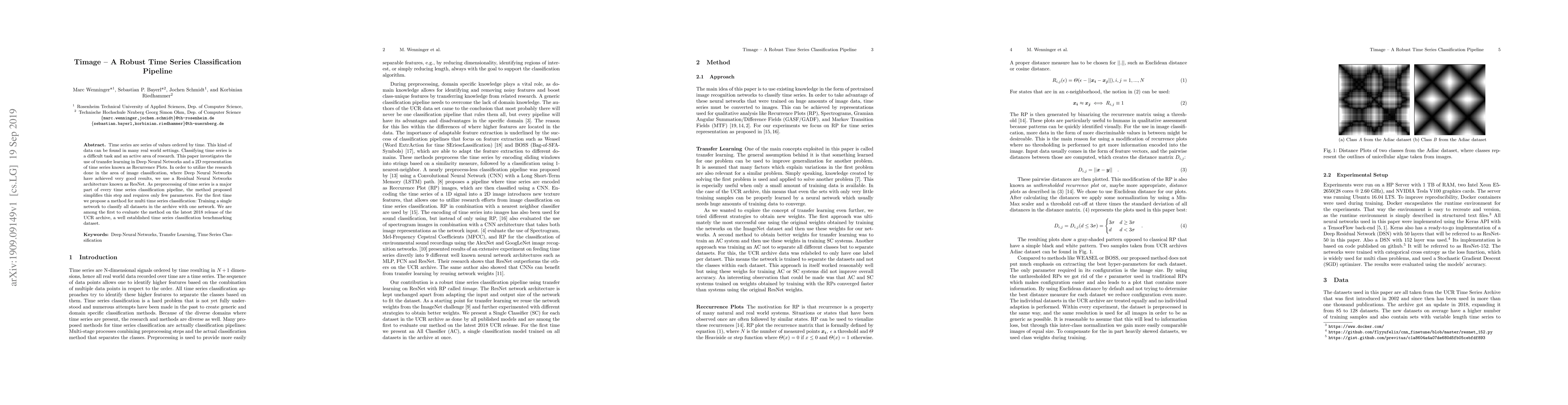 This paper proposes a robust time series classification pipeline named Timage, utilizing transfer learning with ResNet on Recurrence Plots for time series representation. The method simplifies preprocessing and trains a single network for multi-time series classification, evaluated on the latest UCR archive dataset.