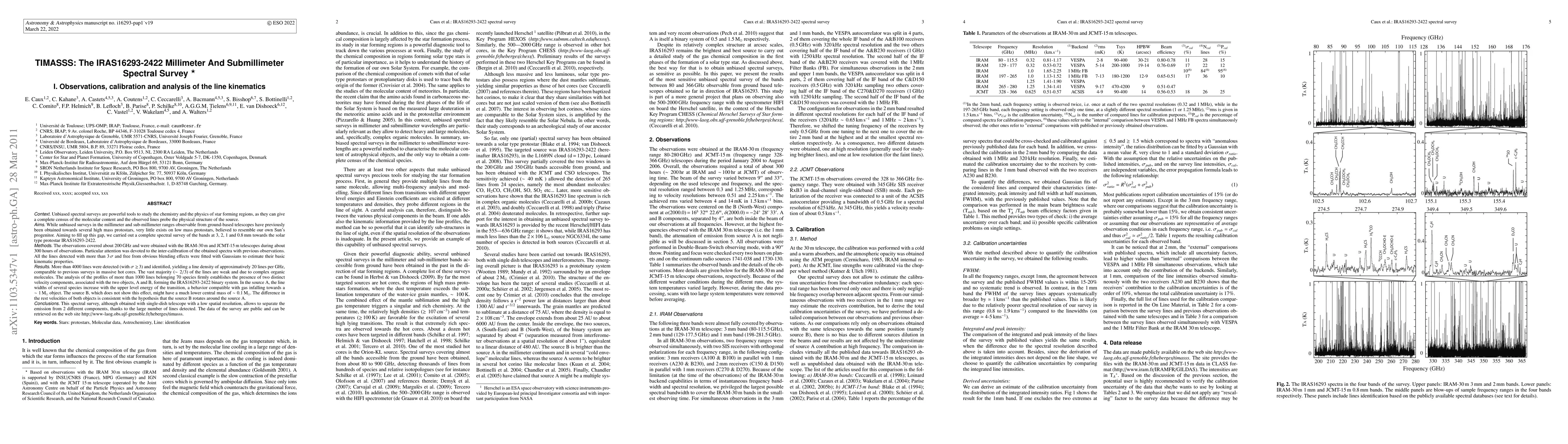 While unbiased surveys observable from ground-based telescopes have previously been obtained towards several high mass protostars, very little exists on low mass protostars. To fill up this gap, we carried out a complete spectral survey of the bands at 3, 2, 1 and 0.8 mm towards the solar type protostar IRAS16293-2422. The observations covered about 200\,GHz and were obtained with the IRAM-30m and JCMT-15m telescopes. Particular attention was devoted to the inter-calibration of the obtained spectra with previous observations. All the lines detected with more than 3 sigma and free from obvious blending effects were fitted with Gaussians to estimate their basic kinematic properties. More than 4000 lines were detected (with sigma \geq 3) and identified, yielding a line density of approximatively 20 lines per GHz, comparable to previous surveys in massive hot cores. The vast majority (~2/3) of the lines are weak and due to complex organic molecules. The analysis of the profiles of more than 1000 lines belonging 70 species firmly establishes the presence of two distinct velocity components, associated with the two objects, A and B, forming the IRAS16293-2422 binary system. In the source A, the line widths of several species increase with the upper level energy of the transition, a behavior compatible with gas infalling towards a ~1 Mo object. The source B, which does not show this effect, might have a much lower central mass of ~0.1 Mo. The difference in the rest velocities of both objects is consistent with the hypothesis that the source B rotates around the source A. This spectral survey, although obtained with single-dish telescope with a low spatial resolution, allows to separate the emission from 2 different components, thanks to the large number of lines detected. The data of the survey are public and can be retrieved on the web site http://www-laog.obs.ujf-grenoble.fr/heberges/timasss.
