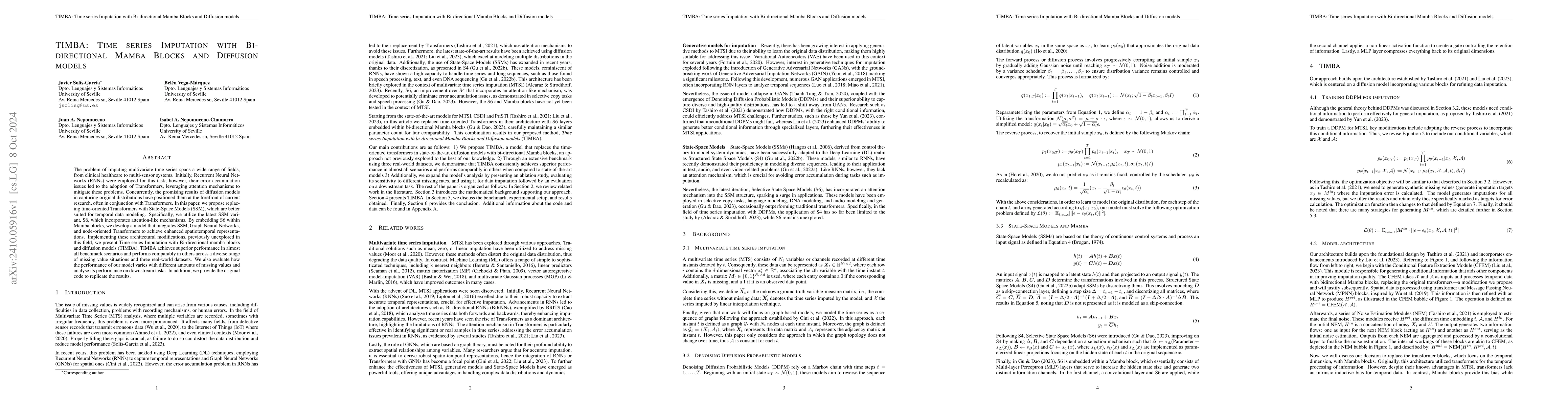 This paper proposes TIMBA, a novel model for imputing multivariate time series using State-Space Models (SSM) within bi-directional Mamba blocks and diffusion models, achieving superior performance across various benchmarks and real-world datasets. The model integrates advanced temporal data modeling techniques and is supported by original code for replication.