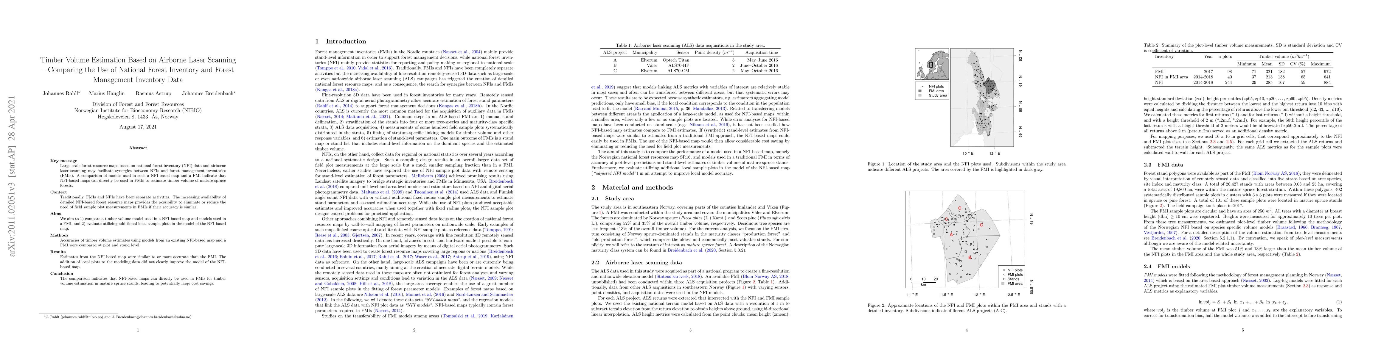 This study compares timber volume estimation models derived from national forest inventory (NFI) data and airborne laser scanning with those from forest management inventories (FMI). Results show that NFI-based maps can be directly used in FMIs for estimating timber volume in mature spruce forests, potentially reducing the need for field measurements and leading to cost savings.