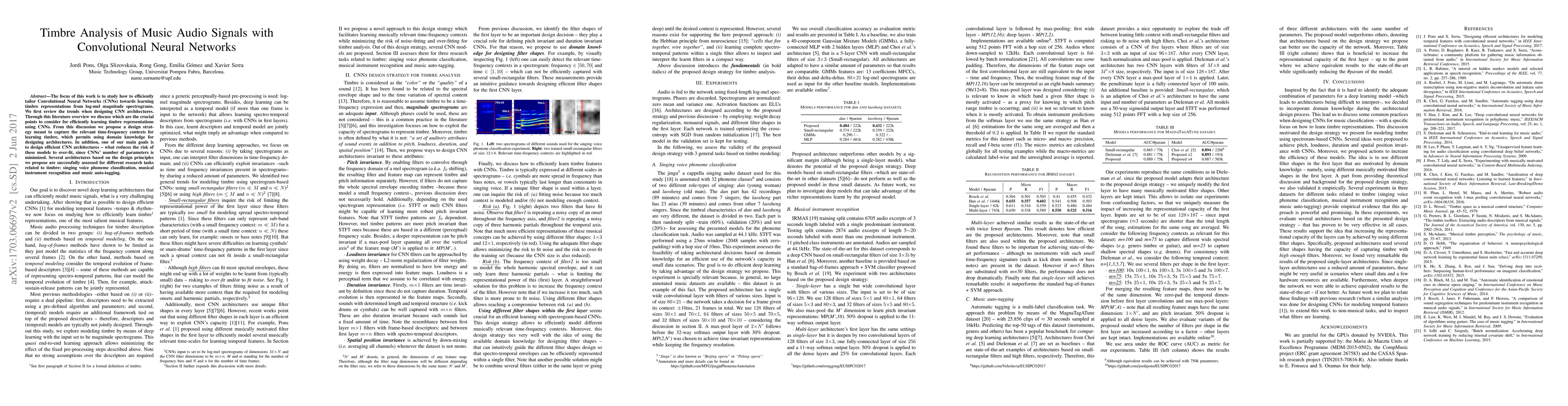 This paper explores optimizing Convolutional Neural Networks (CNNs) for learning timbre representations from log-mel spectrograms, proposing a design strategy that leverages domain knowledge to minimize overfitting while capturing relevant time-frequency contexts. The proposed architectures are evaluated for tasks like singing voice classification, instrument recognition, and music auto-tagging.