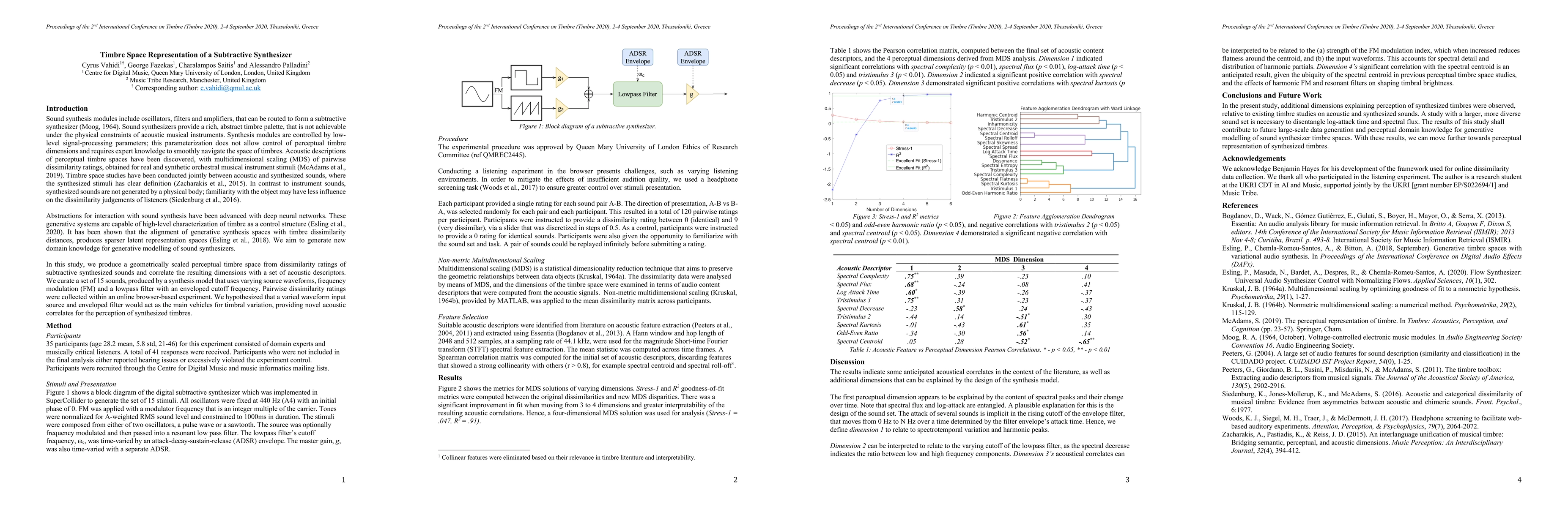 In this study, we produce a geometrically scaled perceptual timbre space from dissimilarity ratings of subtractive synthesized sounds and correlate the resulting dimensions with a set of acoustic descriptors. We curate a set of 15 sounds, produced by a synthesis model that uses varying source waveforms, frequency modulation (FM) and a lowpass filter with an enveloped cutoff frequency. Pairwise dissimilarity ratings were collected within an online browser-based experiment. We hypothesized that a varied waveform input source and enveloped filter would act as the main vehicles for timbral variation, providing novel acoustic correlates for the perception of synthesized timbres.