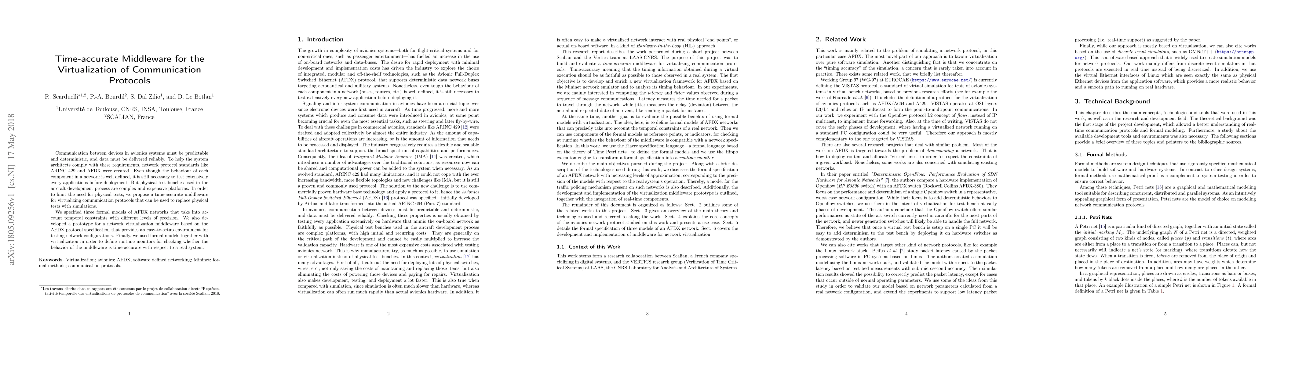 Communication between devices in avionics systems must be predictable and deterministic, and data must be delivered reliably. To help the system architects comply with these requirements, network protocol standards like ARINC 429 and AFDX were created. Even though the behaviour of each component in a network is well defined, it is still necessary to test extensively every applications before deployment. But physical test benches used in the aircraft development process are complex and expensive platforms. In order to limit the need for physical tests, we propose a time-accurate middleware for virtualizing communication protocols that can be used to replace physical tests with simulations. We specified three formal models of AFDX networks that take into account temporal constraints with different levels of precision. We also developed a prototype for a network virtualization middleware based on the AFDX protocol specification that provides an easy-to-setup environment for testing network configurations. Finally, we used formal models together with virtualization in order to define runtime monitors for checking whether the behavior of the middleware is time-accurate with respect to a real system.
