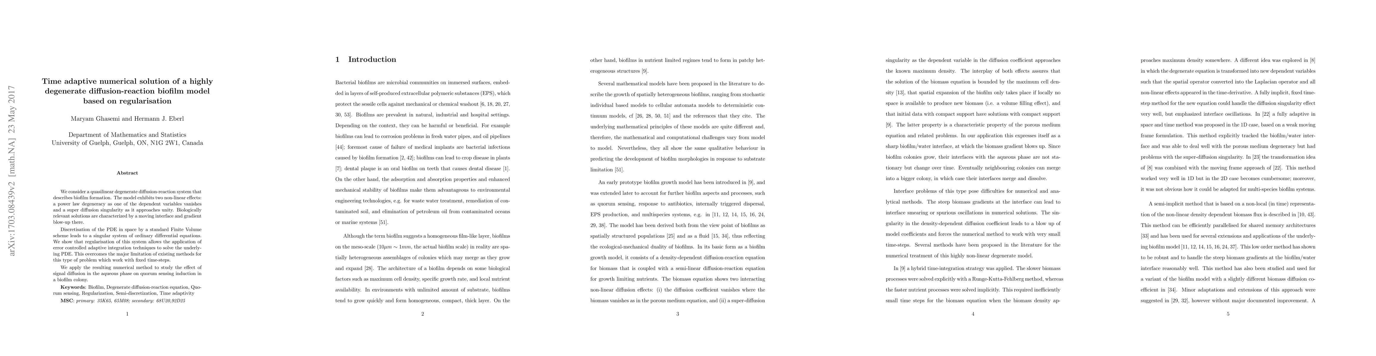 We consider a quasilinear degenerate diffusion-reaction system that describes biofilm formation. The model exhibits two non-linear effects: a power law degeneracy as one of the dependent variables vanishes and a super diffusion singularity as it approaches unity. Biologically relevant solutions are characterized by a moving interface and gradient blow-up there. Discretisation of the PDE in space by a standard Finite Volume scheme leads to a singular system of ordinary differential equations. We show that regularisation of this system allows the application of error controlled adaptive integration techniques to solve the underlying PDE. This overcomes the major limitation of existing methods for this type of problem which work with fixed time-steps. We apply the resulting numerical method to study the effect of signal diffusion in the aqueous phase on quorum sensing induction in a biofilm colony.