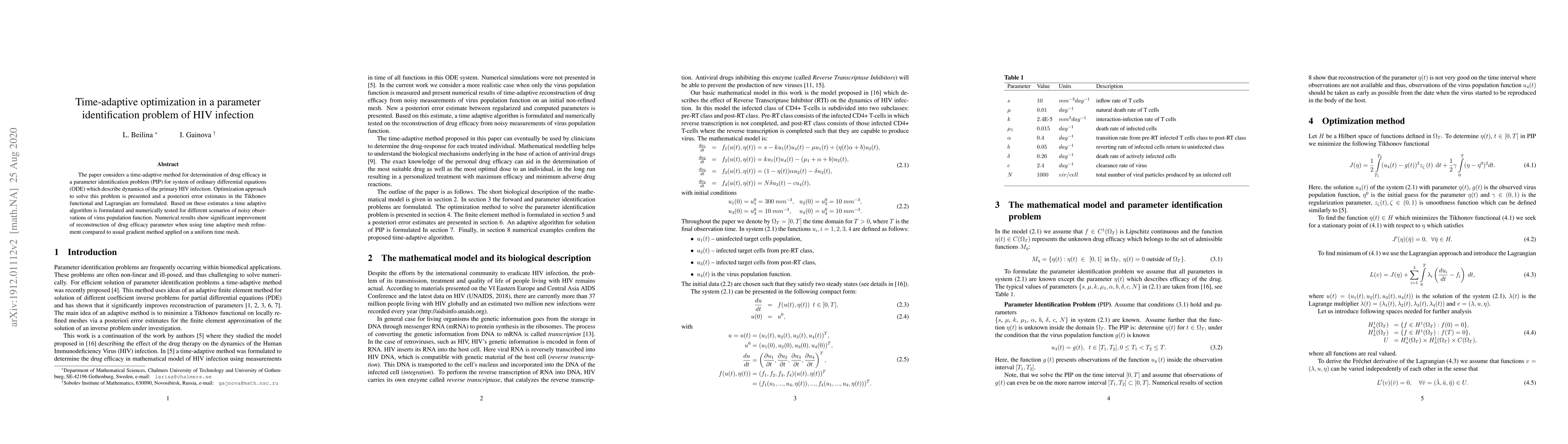 The paper proposes a time-adaptive optimization method for determining drug efficacy in HIV infection models, improving parameter identification through adaptive mesh refinement. Numerical tests demonstrate superior reconstruction of drug efficacy parameters compared to traditional gradient methods.