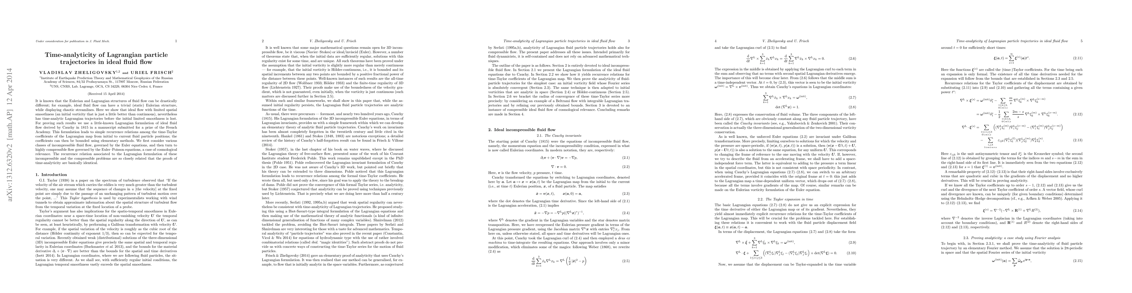 It is known that the Eulerian and Lagrangian structures of fluid flow can be drastically different; for example, ideal fluid flow can have a trivial (static) Eulerian structure, while displaying chaotic streamlines. Here we show that ideal flow with limited spatial smoothness (an initial vorticity that is just a little better than continuous), nevertheless has time-analytic Lagrangian trajectories before the initial limited smoothness is lost. For proving such results we use a little-known Lagrangian formulation of ideal fluid flow derived by Cauchy in 1815 in a manuscript submitted for a prize of the French Academy. This formulation leads to simple recurrence relations among the time-Taylor coefficients of the Lagrangian map from initial to current fluid particle positions; the coefficients can then be bounded using elementary methods. We first consider various classes of incompressible fluid flow, governed by the Euler equations, and then turn to a case of compressible flow of cosmological relevance, governed by the Euler-Poisson equations.