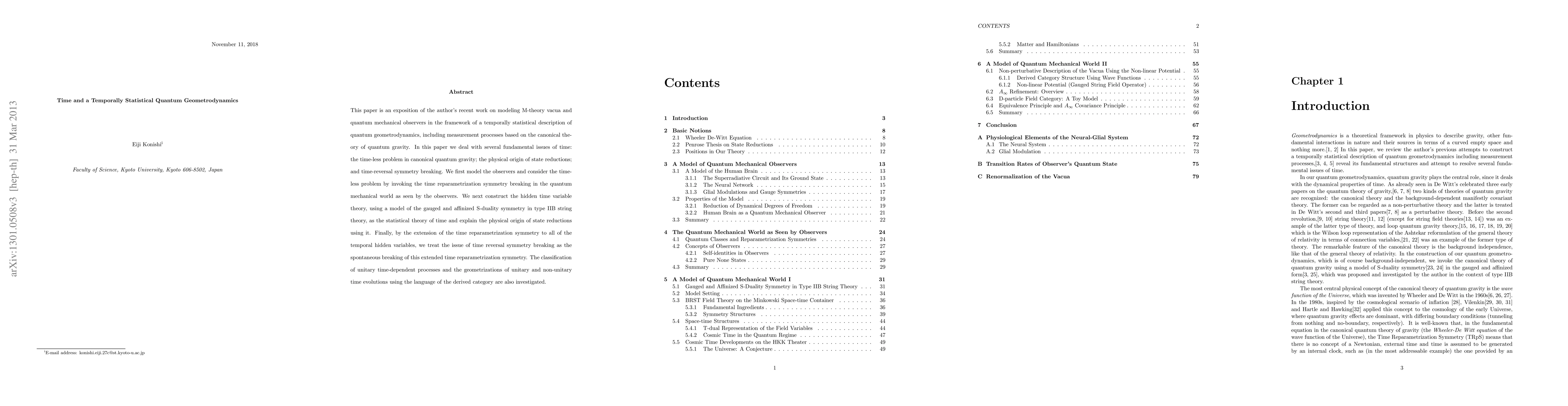 This paper is an exposition of the author's recent work (arXiv:1001.3382 [hep-th], arXiv:1005.5430 [cond-mat.dis-nn], arXiv:1212.4956 [quant-ph]) on modeling M-theory vacua and quantum mechanical observers in the framework of a temporally statistical description of quantum geometrodynamics, including measurement processes based on the canonical theory of quantum gravity. In this paper we deal with several fundamental issues of time: the time-less problem in canonical quantum gravity; the physical origin of state reductions; and time-reversal symmetry breaking. We first model the observers and consider the time-less problem by invoking the time reparametrization symmetry breaking in the quantum mechanical world as seen by the observers. We next construct the hidden time variable theory, using a model of the gauged and affinized S-duality symmetry in type IIB string theory, as the statistical theory of time and explain the physical origin of state reductions using it. Finally, by the extension of the time reparametrization symmetry to all of the temporal hidden variables, we treat the issue of time reversal symmetry breaking as the spontaneous breaking of this extended time reparametrization symmetry. The classification of unitary time-dependent processes and the geometrizations of unitary and non-unitary time evolutions using the language of the derived category are also investigated.