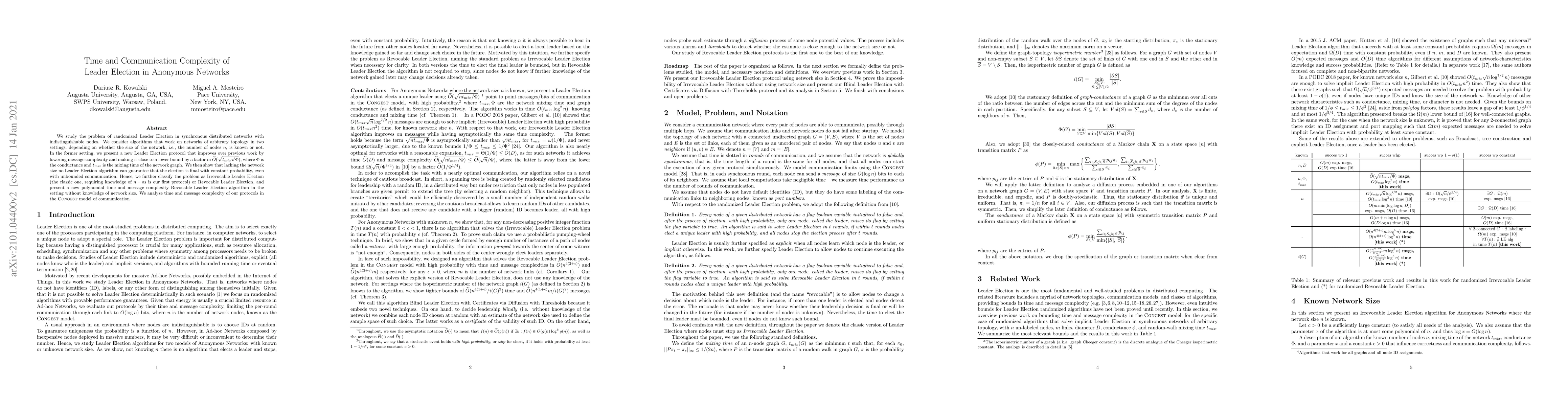 We study the problem of randomized Leader Election in synchronous distributed networks with indistinguishable nodes. We consider algorithms that work on networks of arbitrary topology in two settings, depending on whether the size of the network, i.e., the number of nodes, is known or not. In the former setting, we present a new Leader Election protocol that improves over previous work by lowering message complexity and making it close to a lower bound by a factor of $\tilde{O}(\sqrt{t_{mix}\sqrt{\Phi}})$, where $\Phi$ is the conductance and $t_{mix}$ is the mixing time of the network graph. We then show that lacking the network size no Leader Election algorithm can guarantee that the election is final with constant probability, even with unbounded communication. Hence, we further classify the problem as Irrevocable Leader Election (the classic one, requiring knowledge of n - as is our first protocol) or Revocable Leader Election, and present a new polynomial time and message complexity Revocable Leader Election algorithm in the setting without knowledge of network size. We analyze time and message complexity of our protocols in the Congest model of communication.