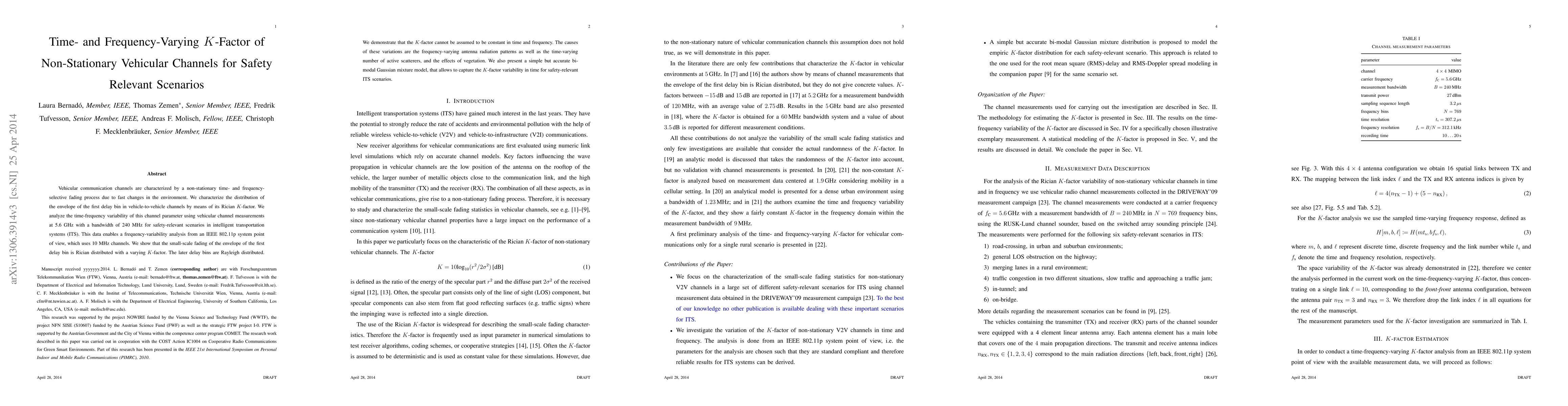 This paper investigates the time- and frequency-varying $K$-factor of non-stationary vehicular channels for safety scenarios, showing that it varies due to antenna patterns and environmental factors. A bi-modal Gaussian mixture model is proposed to accurately capture this variability.