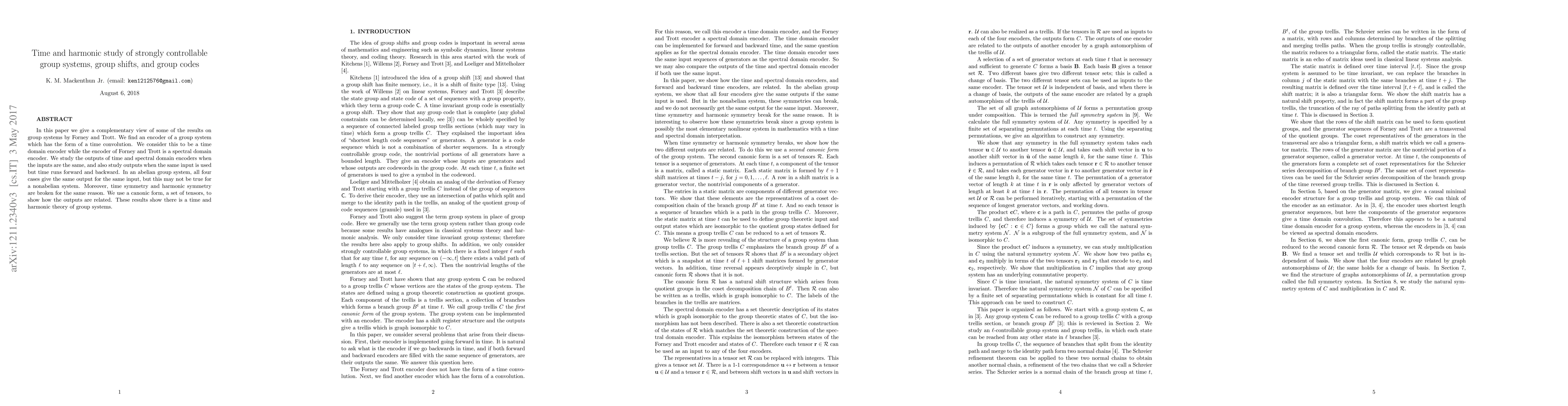 In this paper we give a complementary view of some of the results on group systems by Forney and Trott. We find an encoder of a group system which has the form of a time convolution. We consider this to be a time domain encoder while the encoder of Forney and Trott is a spectral domain encoder. We study the outputs of time and spectral domain encoders when the inputs are the same, and also study outputs when the same input is used but time runs forward and backward. In an abelian group system, all four cases give the same output for the same input, but this may not be true for a nonabelian system. Moreover, time symmetry and harmonic symmetry are broken for the same reason. We use a canonic form, a set of tensors, to show how the outputs are related. These results show there is a time and harmonic theory of group systems.