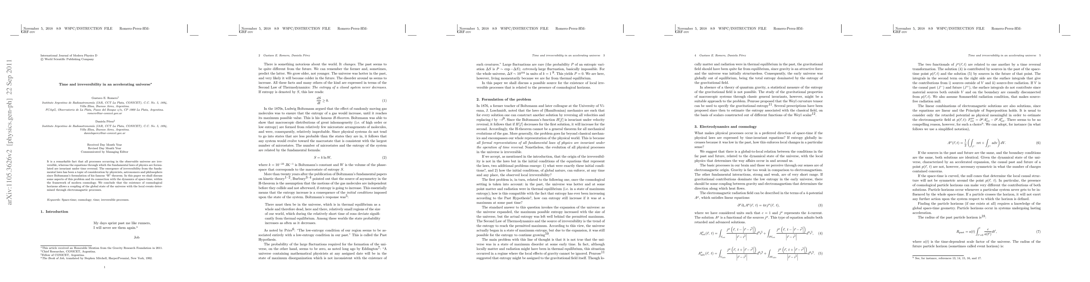 This paper explores the emergence of time's arrow and irreversibility in the observable universe despite time-reversal invariant laws of physics, linking this phenomenon to the dynamics of space-time and the role of cosmological horizons in coupling global cosmic states with local electromagnetic processes.