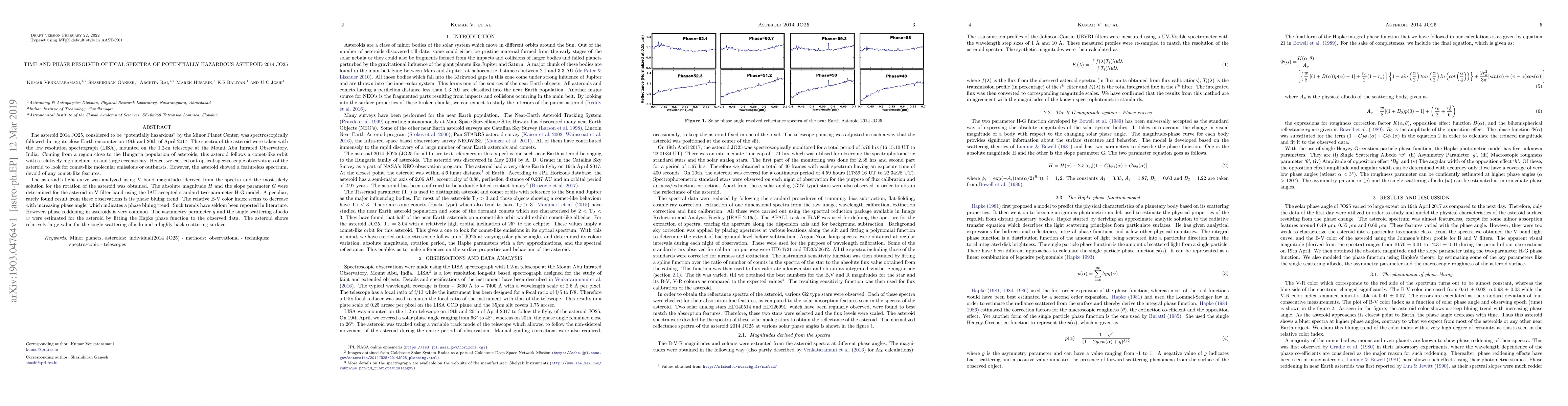 Asteroid 2014 JO25's optical spectra showed a featureless spectrum without comet-like features, but its rotation and phase bluing trend were unusual, with a decrease in B-V color index as phase angle increased.