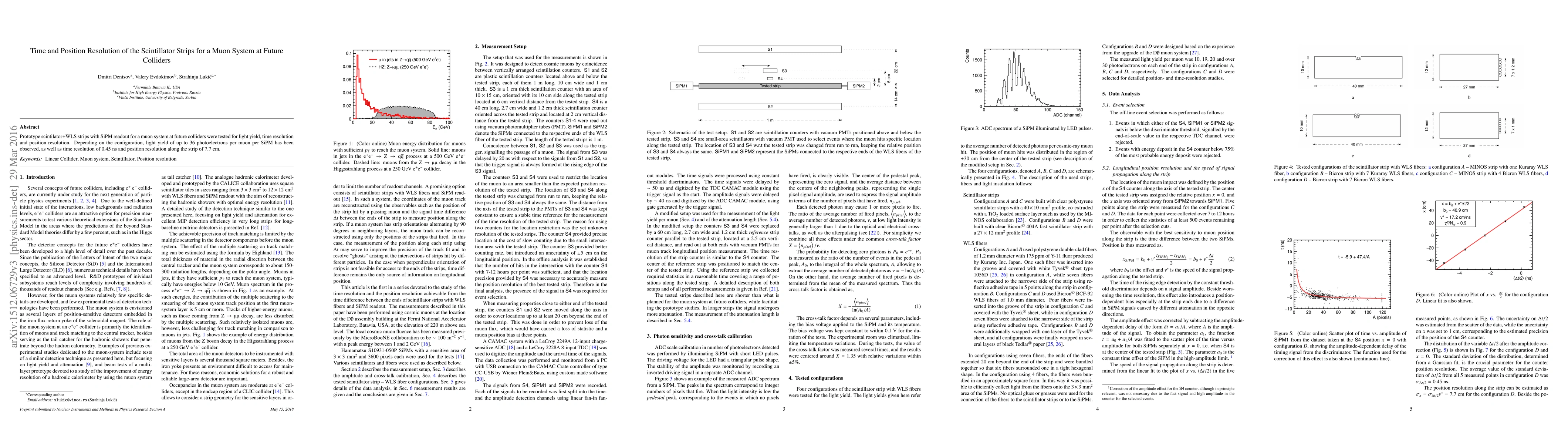 This study evaluates prototype scintillator+WLS strips with SiPM readout for future colliders, achieving up to 36 photoelectrons per muon, 0.45 ns time resolution, and 7.7 cm position resolution along the strips.