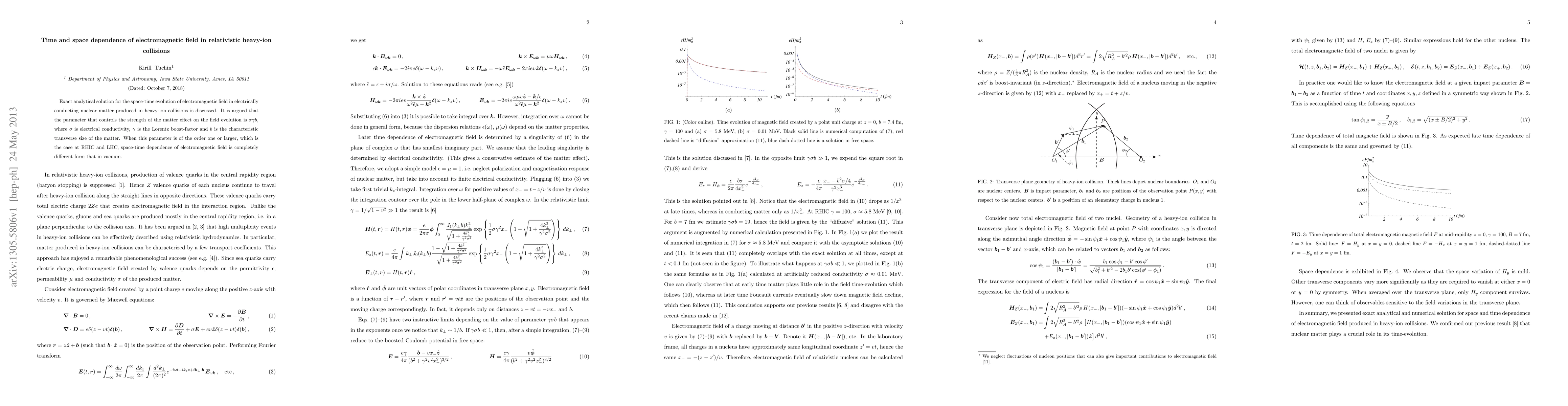 Exact analytical solution for the space-time evolution of electromagnetic field in electrically conducting nuclear matter produced in heavy-ion collisions is discussed. It is argued that the parameter that controls the strength of the matter effect on the field evolution is $\sigma\gamma b$, where $\sigma$ is electrical conductivity, $\gamma$ is the Lorentz boost-factor and $b$ is the characteristic transverse size of the matter. When this parameter is of the order one or larger, which is the case at RHIC and LHC, space-time dependence of electromagnetic field is completely different form that in vacuum.