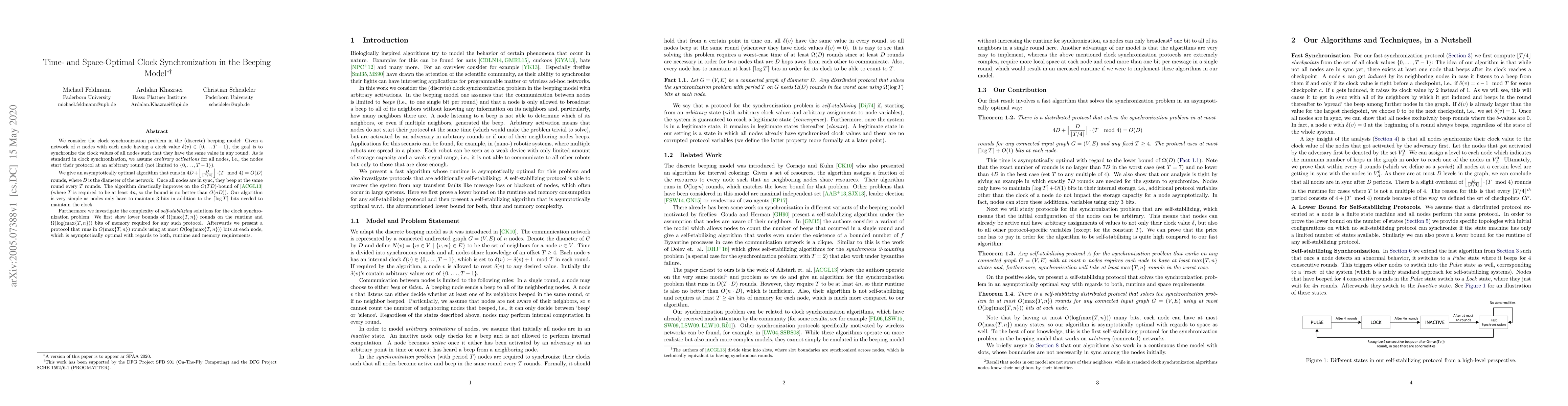 A new algorithm for clock synchronization in a network of nodes, running in O(D) rounds and requiring only 3 additional bits per node, improves upon previous bounds and offers insights into the complexity of self-stabilizing solutions.