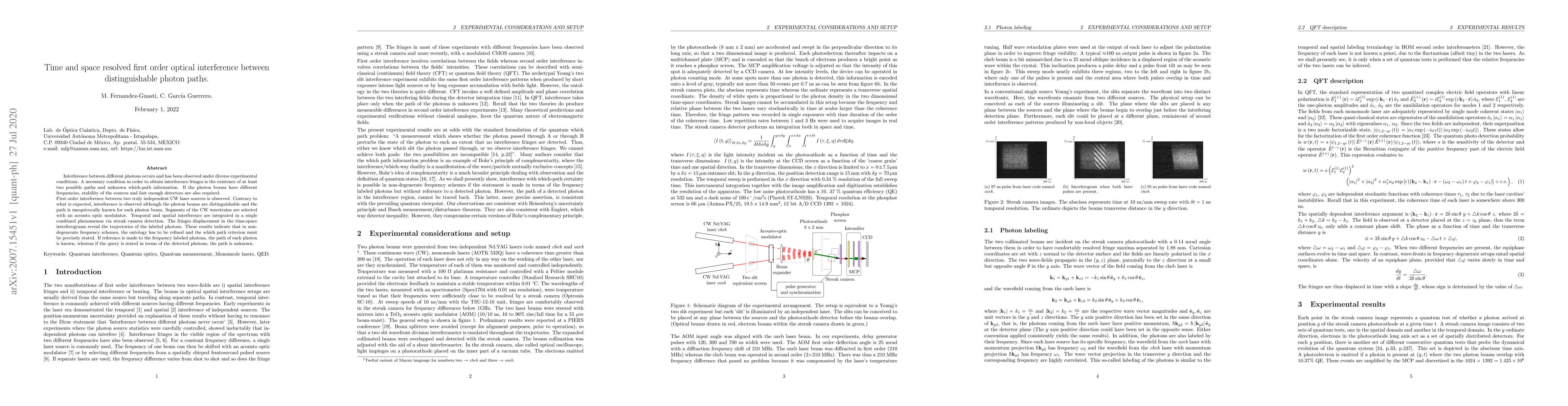 This paper observes first-order interference between distinguishable photons from independent CW laser sources, challenging the which-path criterion. The study uses acousto-optic modulators and streak cameras to reveal temporal and spatial interference, suggesting a need to refine the ontology of photon paths in non-degenerate frequency schemes.