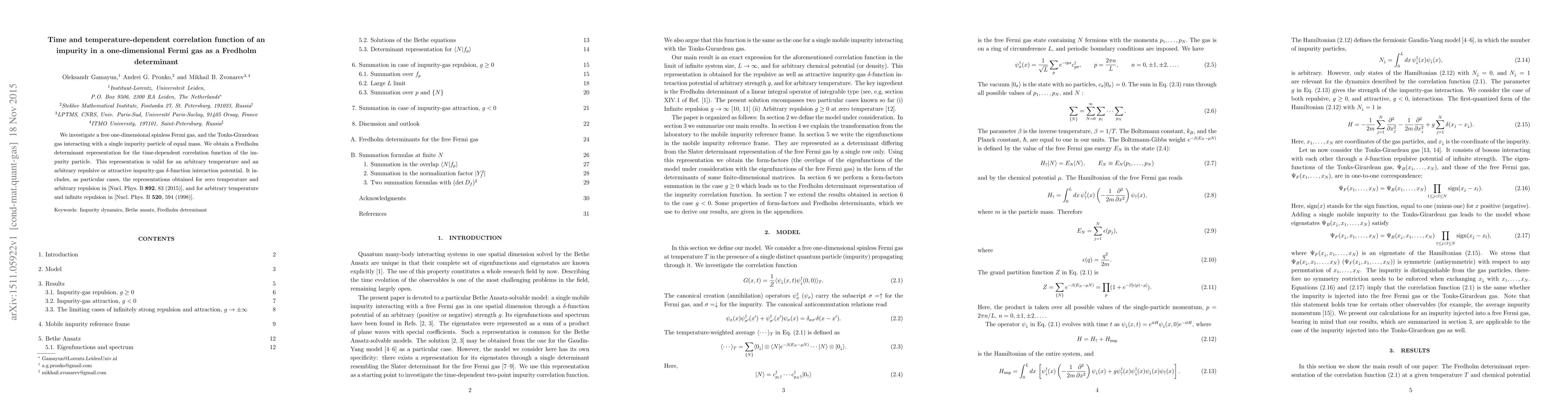 We investigate a free one-dimensional spinless Fermi gas, and the Tonks-Girardeau gas interacting with a single impurity particle of equal mass. We obtain a Fredholm determinant representation for the time-dependent correlation function of the impurity particle. This representation is valid for an arbitrary temperature and an arbitrary repulsive or attractive impurity-gas $\delta$-function interaction potential. It includes, as particular cases, the representations obtained for zero temperature and arbitrary repulsion in [Nucl. Phys. B 892, 83 (2015)], and for arbitrary temperature and infinite repulsion in [Nucl. Phys. B 520, 594 (1998)].