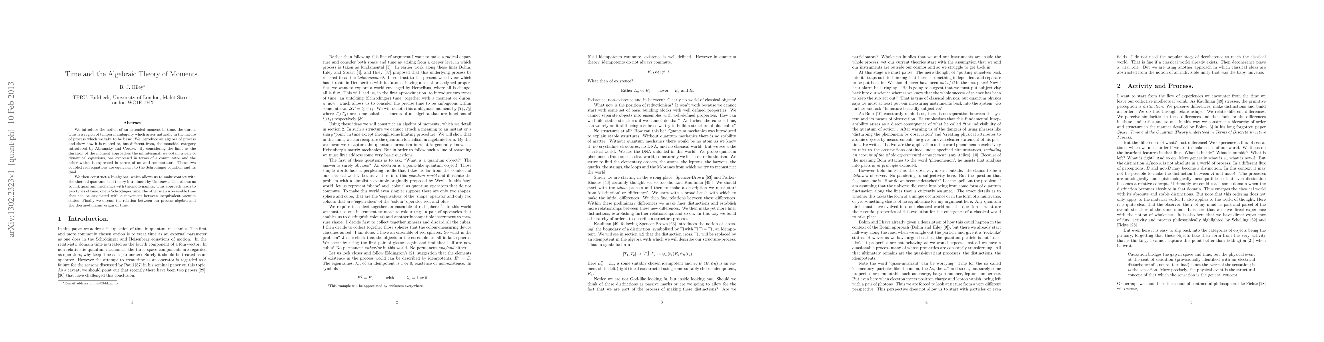 We introduce the notion of an extended moment in time, the duron. This is a region of temporal ambiguity which arises naturally in the nature of process which we take to be basic. We introduce an algebra of process and show how it is related to, but different from, the monoidal category introduced by Abramsky and Coecke. By considering the limit as the duration of the moment approaches the infinitesimal, we obtain a pair of dynamical equations, one expressed in terms of a commutator and the other which is expressed in terms of an anti-commutator. These two coupled real equations are equivalent to the Schr\"odinger equation and its dual. We then construct a bi-algebra, which allows us to make contact with the thermal quantum field theory introduced by Umezawa. This allows us to link quantum mechanics with thermodynamics. This approach leads to two types of time, one is Schr\"odinger time, the other is an irreversible time that can be associated with a movement between inequivalent vacuum states. Finally we discuss the relation between our process algebra and the thermodynamic origin of time.
