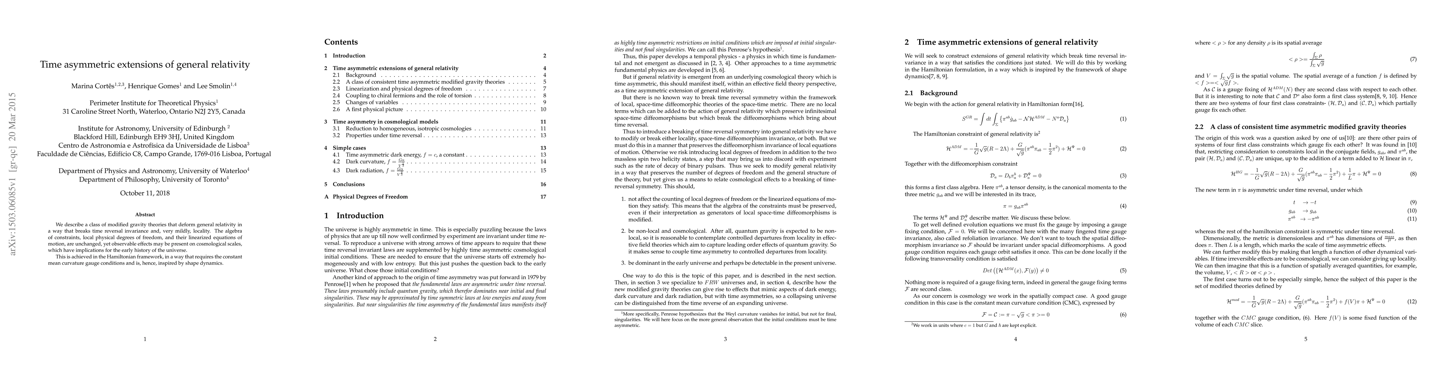 We describe a class of modified gravity theories that deform general relativity in a way that breaks time reversal invariance and, very mildly, locality. The algebra of constraints, local physical degrees of freedom, and their linearized equations of motion, are unchanged, yet observable effects may be present on cosmological scales, which have implications for the early history of the universe. This is achieved in the Hamiltonian framework, in a way that requires the constant mean curvature gauge conditions and is, hence, inspired by shape dynamics.