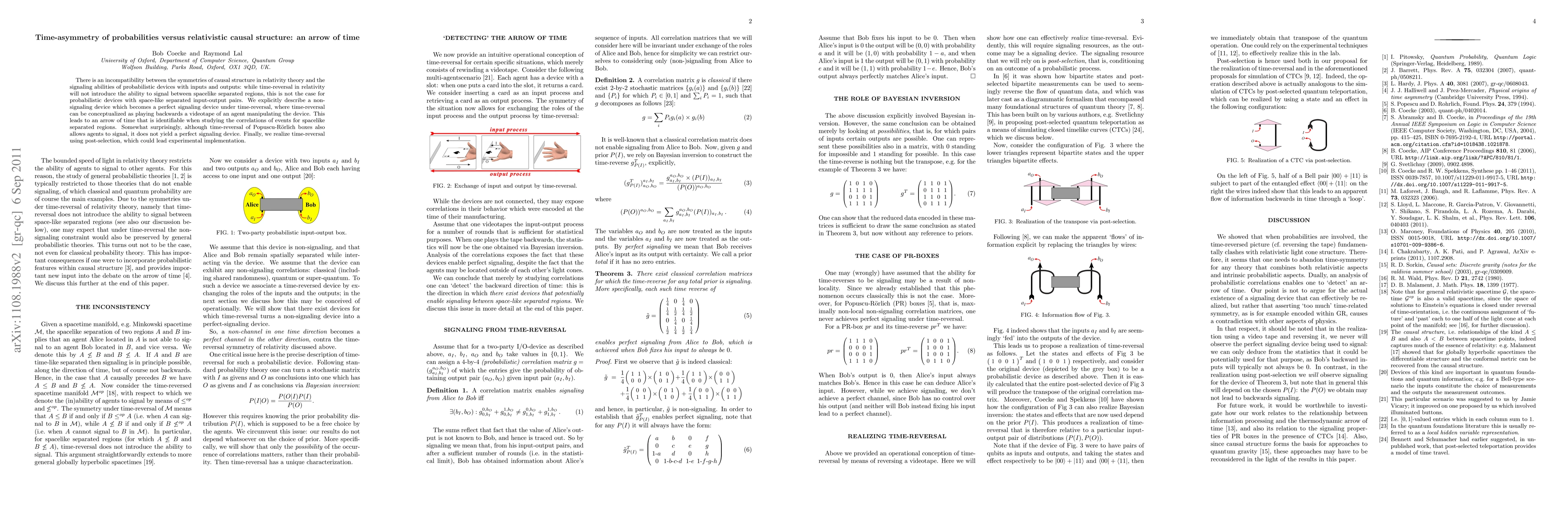 There is an incompatibility between the symmetries of causal structure in relativity theory and the signaling abilities of probabilistic devices with inputs and outputs: while time-reversal in relativity will not introduce the ability to signal between spacelike separated regions, this is not the case for probabilistic devices with space-like separated input-output pairs. We explicitly describe a non-signaling device which becomes a perfect signaling device under time-reversal, where time-reversal can be conceptualized as playing backwards a videotape of an agent manipulating the device. This leads to an arrow of time that is identifiable when studying the correlations of events for spacelike separated regions. Somewhat surprisingly, although time-reversal of Popuscu-Roerlich boxes also allows agents to signal, it does not yield a perfect signaling device. Finally, we realize time-reversal using post-selection, which could lead experimental implementation.