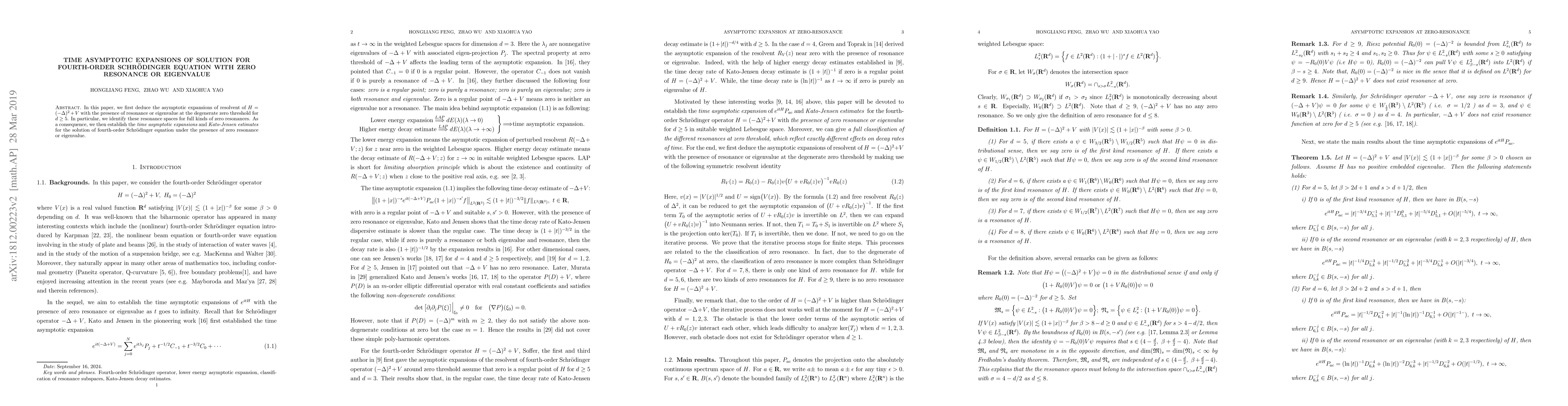 This paper derives asymptotic expansions for the resolvent of a fourth-order Schrödinger operator with zero resonance or eigenvalue, identifying resonance spaces for various zero resonances. It also establishes time asymptotic expansions and Kato-Jensen estimates for the solution of the fourth-order Schrödinger equation under these conditions.