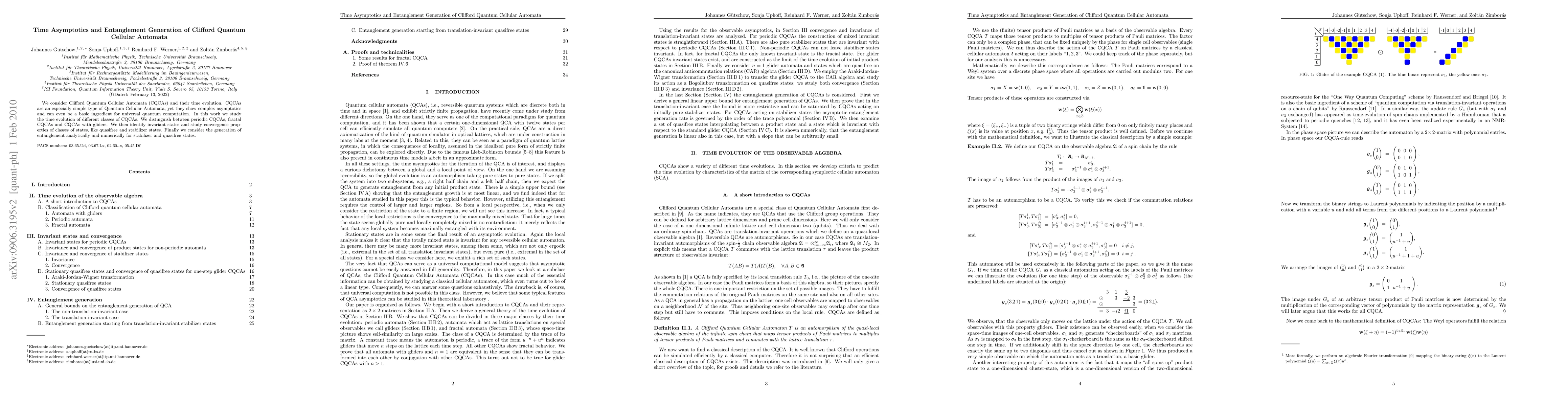 This paper investigates the time evolution and entanglement generation in Clifford Quantum Cellular Automata (CQCAs), distinguishing between periodic, fractal, and glider-based CQCAs. It analyzes invariant states and convergence properties, and studies entanglement analytically and numerically for stabilizer and quasifree states.