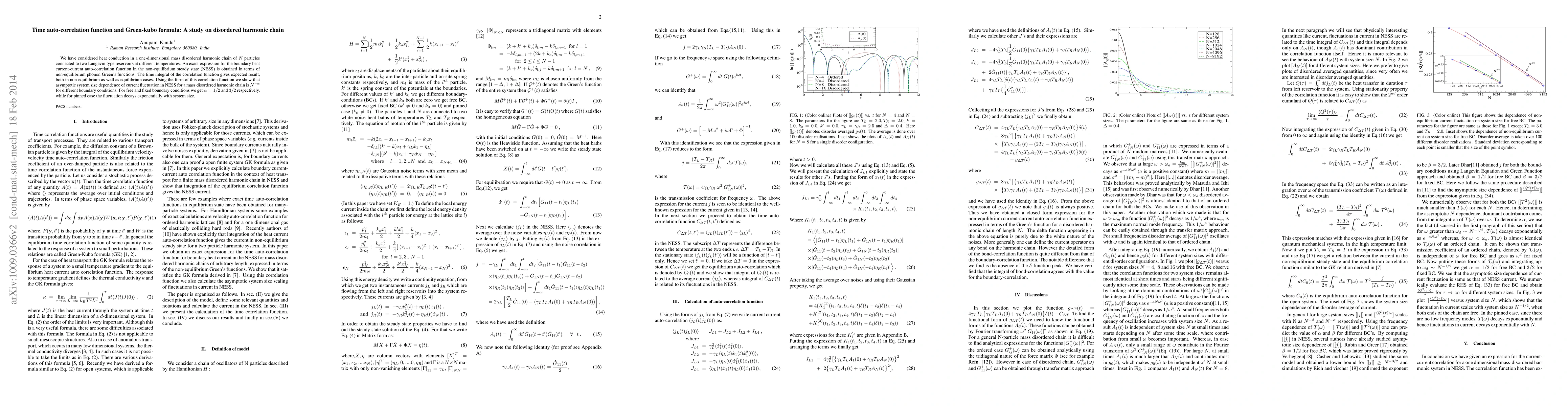 This paper investigates heat conduction in a one-dimensional disordered harmonic chain connected to temperature reservoirs, deriving an exact expression for the heat current-current auto-correlation function. It finds that the correlation function's time integral yields expected results in both non-equilibrium and equilibrium states, and determines the asymptotic dependence of current fluctuations on the system size under different boundary conditions.