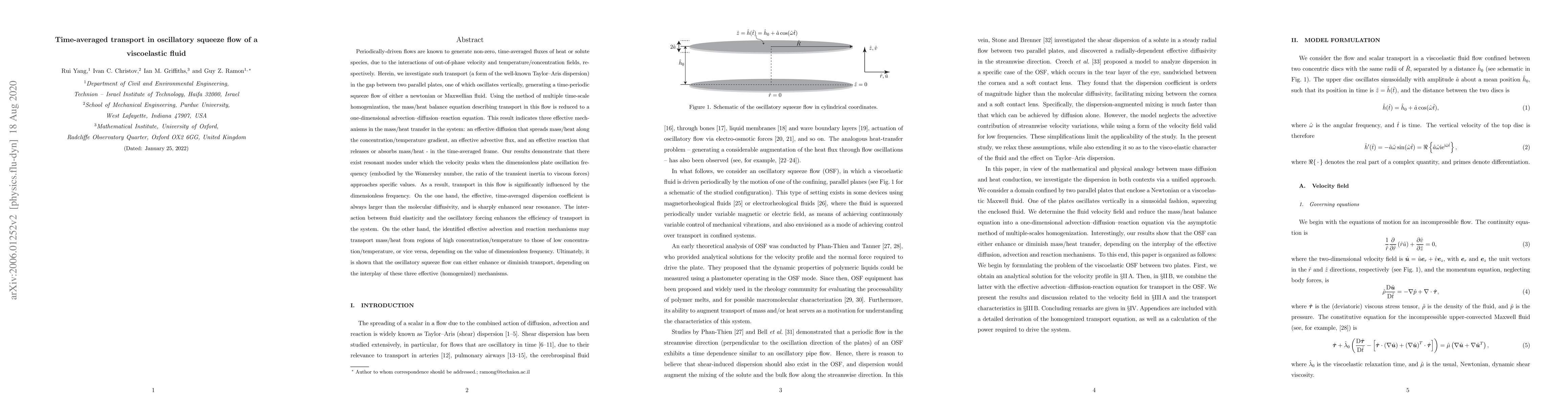This research explores time-averaged transport in oscillatory squeeze flow of viscoelastic fluids, finding three effective mechanisms: diffusion, advective flux, and reaction. Using homogenization, it shows resonant modes enhance transport efficiency, with effective dispersion larger than molecular diffusivity near resonance. Fluid elasticity interacts with oscillatory forcing to boost transport, while advection and reaction mechanisms can move mass/heat based on frequency.