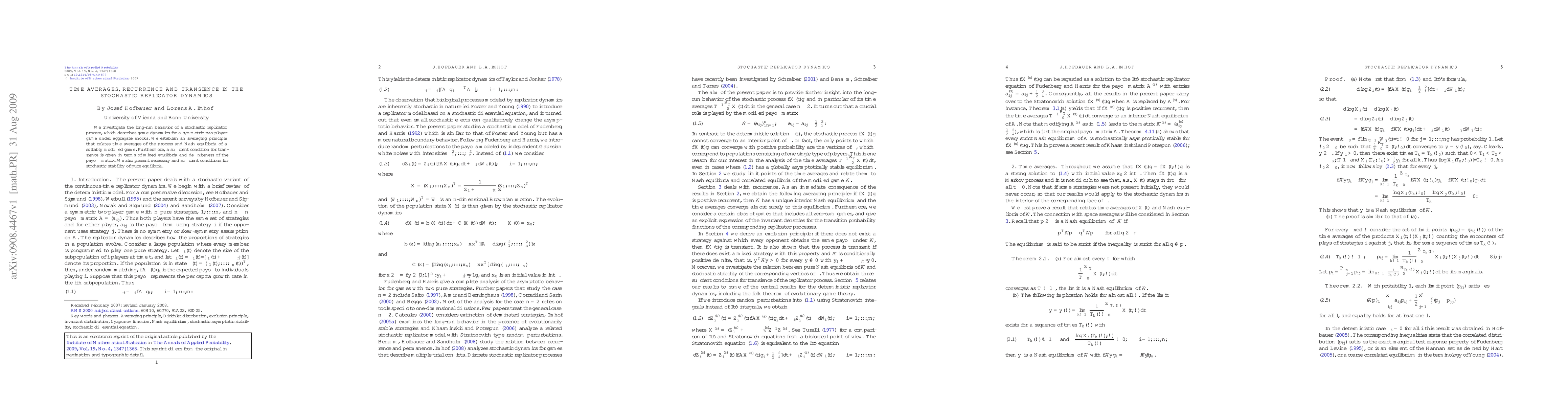 This paper examines the long-term behavior of stochastic replicator dynamics in symmetric two-player games, establishing a connection between time averages and Nash equilibria. It also provides conditions for transience and stochastic stability of pure equilibria based on mixed equilibria and payoff matrix properties.