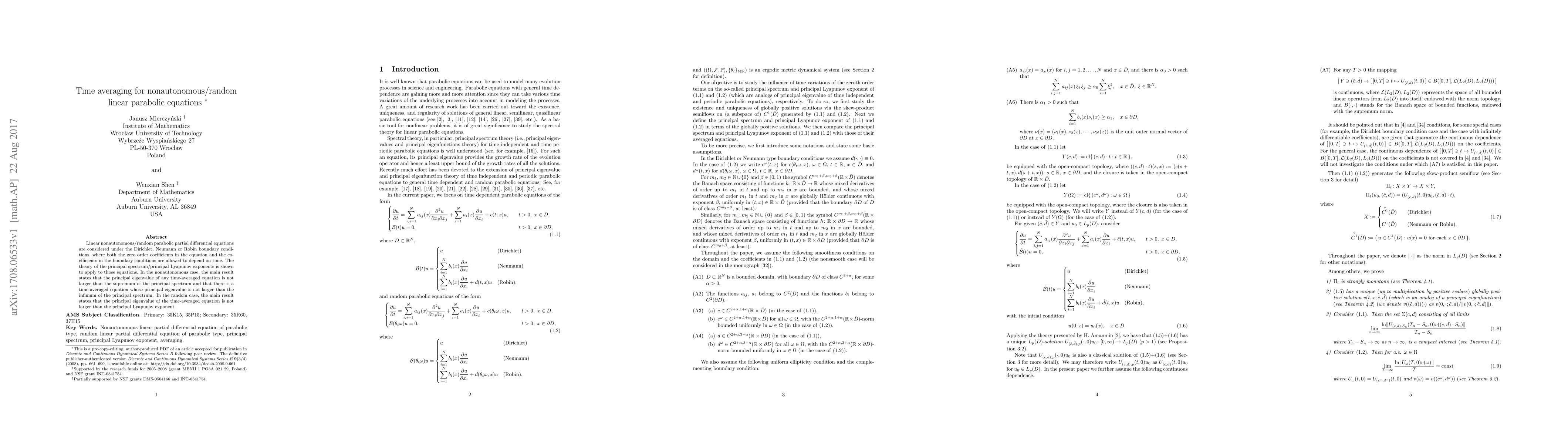 This paper examines linear nonautonomous/random parabolic PDEs with time-dependent coefficients and boundary conditions. It establishes theoretical results on the principal spectrum and Lyapunov exponents, proving that the principal eigenvalue of a time-averaged equation is bounded by the supremum of the principal spectrum and the principal Lyapunov exponent.