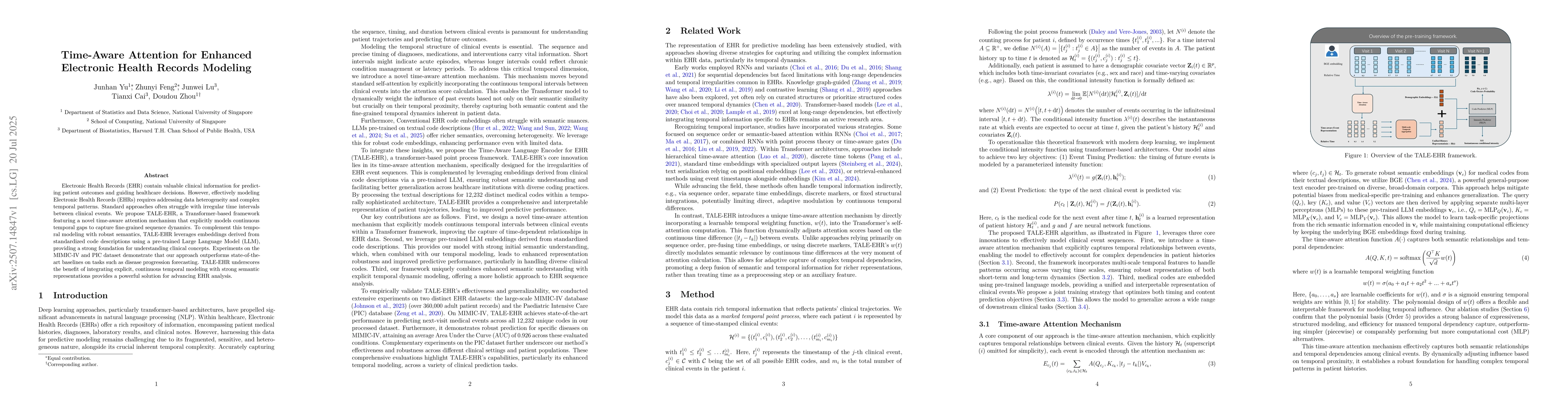 Electronic Health Records (EHR) contain valuable clinical information for predicting patient outcomes and guiding healthcare decisions. However, effectively modeling Electronic Health Records (EHRs) requires addressing data heterogeneity and complex temporal patterns. Standard approaches often struggle with irregular time intervals between clinical events. We propose TALE-EHR, a Transformer-based framework featuring a novel time-aware attention mechanism that explicitly models continuous temporal gaps to capture fine-grained sequence dynamics. To complement this temporal modeling with robust semantics, TALE-EHR leverages embeddings derived from standardized code descriptions using a pre-trained Large Language Model (LLM), providing a strong foundation for understanding clinical concepts. Experiments on the MIMIC-IV and PIC dataset demonstrate that our approach outperforms state-of-the-art baselines on tasks such as disease progression forecasting. TALE-EHR underscores the benefit of integrating explicit, continuous temporal modeling with strong semantic representations provides a powerful solution for advancing EHR analysis.