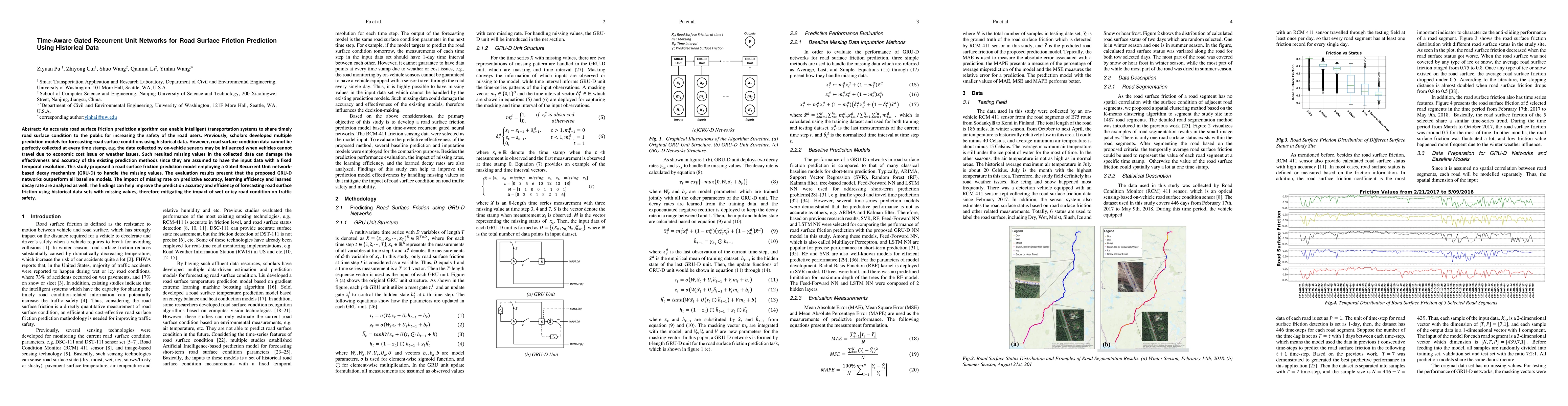 This study proposes a GRU-D network to predict road surface friction using historical data, addressing the issue of missing values. The GRU-D model outperforms baseline methods, improving the accuracy and efficiency of forecasting road surface conditions, thus enhancing traffic safety.