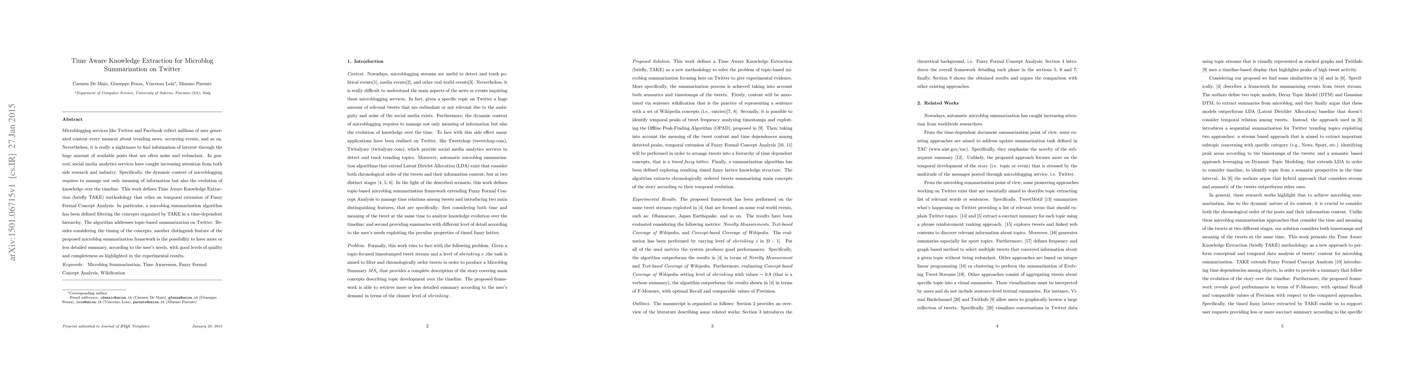 Microblogging services like Twitter and Facebook collect millions of user generated content every moment about trending news, occurring events, and so on. Nevertheless, it is really a nightmare to find information of interest through the huge amount of available posts that are often noise and redundant. In general, social media analytics services have caught increasing attention from both side research and industry. Specifically, the dynamic context of microblogging requires to manage not only meaning of information but also the evolution of knowledge over the timeline. This work defines Time Aware Knowledge Extraction (briefly TAKE) methodology that relies on temporal extension of Fuzzy Formal Concept Analysis. In particular, a microblog summarization algorithm has been defined filtering the concepts organized by TAKE in a time-dependent hierarchy. The algorithm addresses topic-based summarization on Twitter. Besides considering the timing of the concepts, another distinguish feature of the proposed microblog summarization framework is the possibility to have more or less detailed summary, according to the user's needs, with good levels of quality and completeness as highlighted in the experimental results.