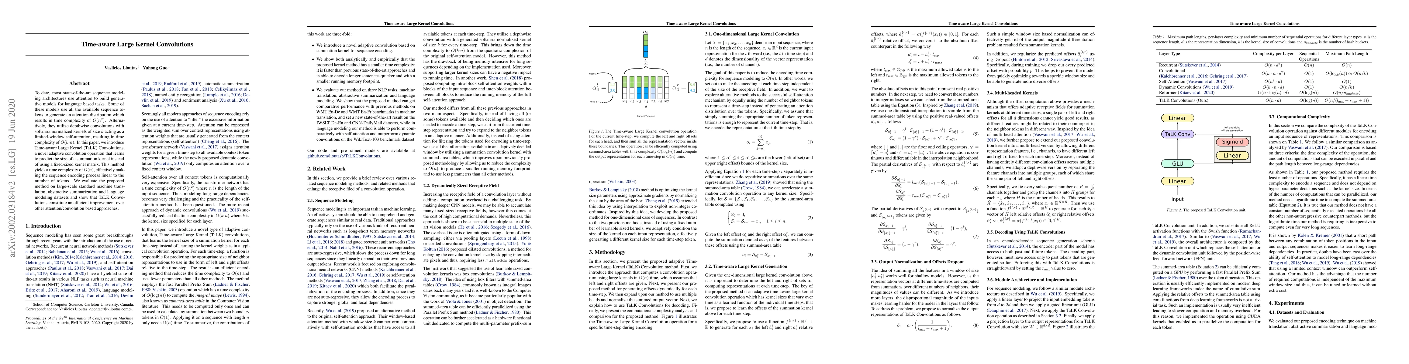 This paper introduces Time-aware Large Kernel (TaLK) Convolutions, an adaptive convolution method that predicts the size of a summation kernel, achieving a linear time complexity of $O(n)$ compared to traditional $O(n^2)$ or $O(k{\cdot}n)$. The method is shown to outperform other attention/convolution methods in machine translation, summarization, and language modeling tasks.