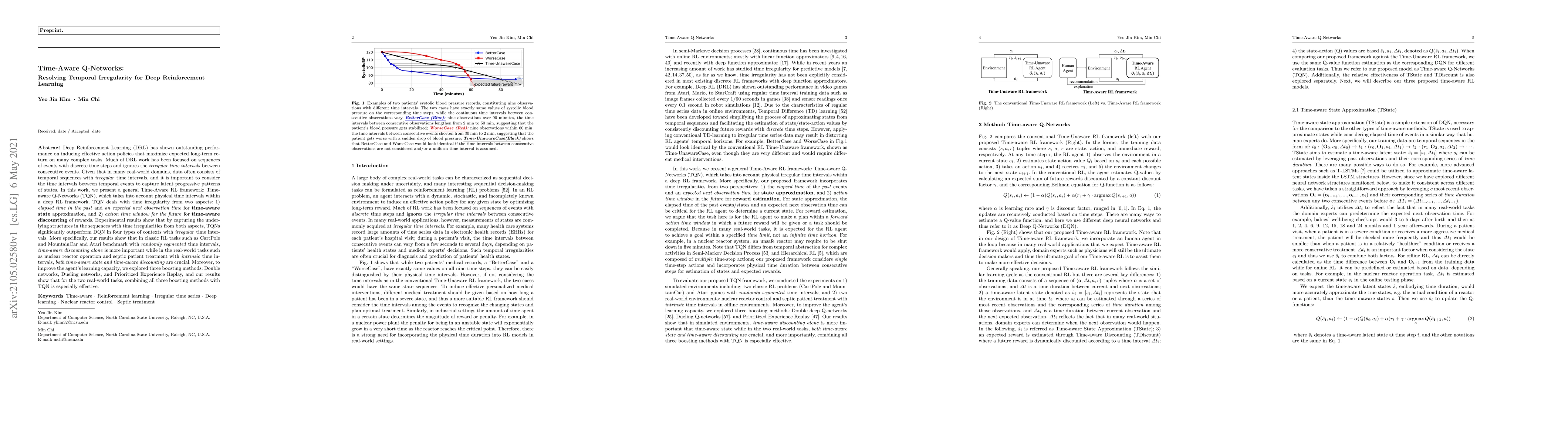 Deep Reinforcement Learning (DRL) has shown outstanding performance on inducing effective action policies that maximize expected long-term return on many complex tasks. Much of DRL work has been focused on sequences of events with discrete time steps and ignores the irregular time intervals between consecutive events. Given that in many real-world domains, data often consists of temporal sequences with irregular time intervals, and it is important to consider the time intervals between temporal events to capture latent progressive patterns of states. In this work, we present a general Time-Aware RL framework: Time-aware Q-Networks (TQN), which takes into account physical time intervals within a deep RL framework. TQN deals with time irregularity from two aspects: 1) elapsed time in the past and an expected next observation time for time-aware state approximation, and 2) action time window for the future for time-aware discounting of rewards. Experimental results show that by capturing the underlying structures in the sequences with time irregularities from both aspects, TQNs significantly outperform DQN in four types of contexts with irregular time intervals. More specifically, our results show that in classic RL tasks such as CartPole and MountainCar and Atari benchmark with randomly segmented time intervals, time-aware discounting alone is more important while in the real-world tasks such as nuclear reactor operation and septic patient treatment with intrinsic time intervals, both time-aware state and time-aware discounting are crucial. Moreover, to improve the agent's learning capacity, we explored three boosting methods: Double networks, Dueling networks, and Prioritized Experience Replay, and our results show that for the two real-world tasks, combining all three boosting methods with TQN is especially effective.