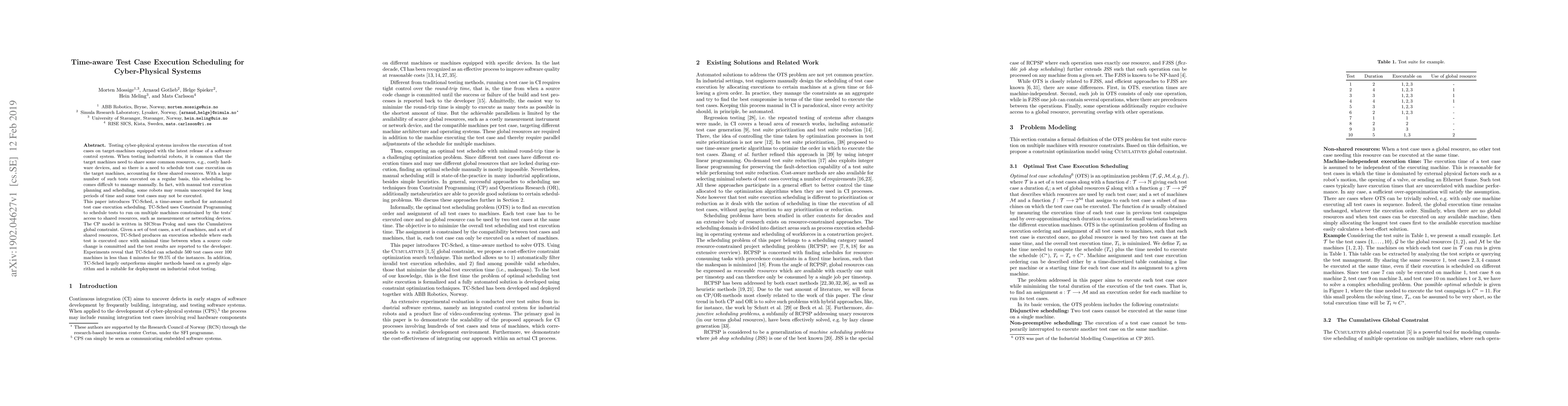 This paper introduces TC-Sched, an automated time-aware method for scheduling test case execution on multiple machines in cyber-physical systems, using Constraint Programming to optimize resource sharing. Experiments show TC-Sched efficiently schedules 500 test cases over 100 machines, significantly outperforming simpler methods.