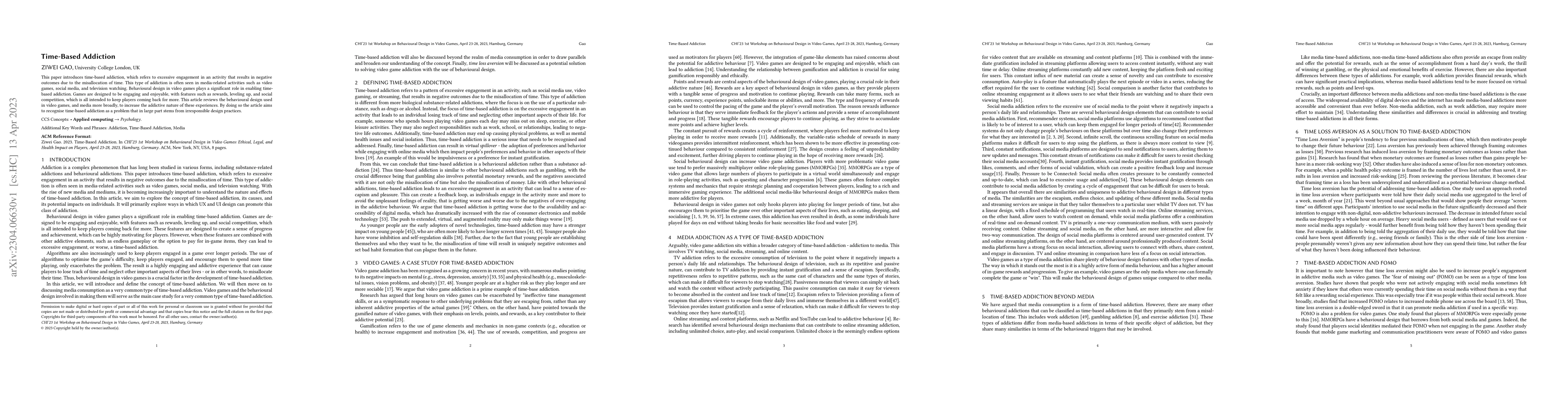 This paper explores time-based addiction, focusing on excessive engagement in media activities leading to negative outcomes due to misallocated time. It highlights how behavioural design in video games, including rewards and social competition, contributes to this addiction, advocating for a recognition of irresponsible design practices as a significant problem.