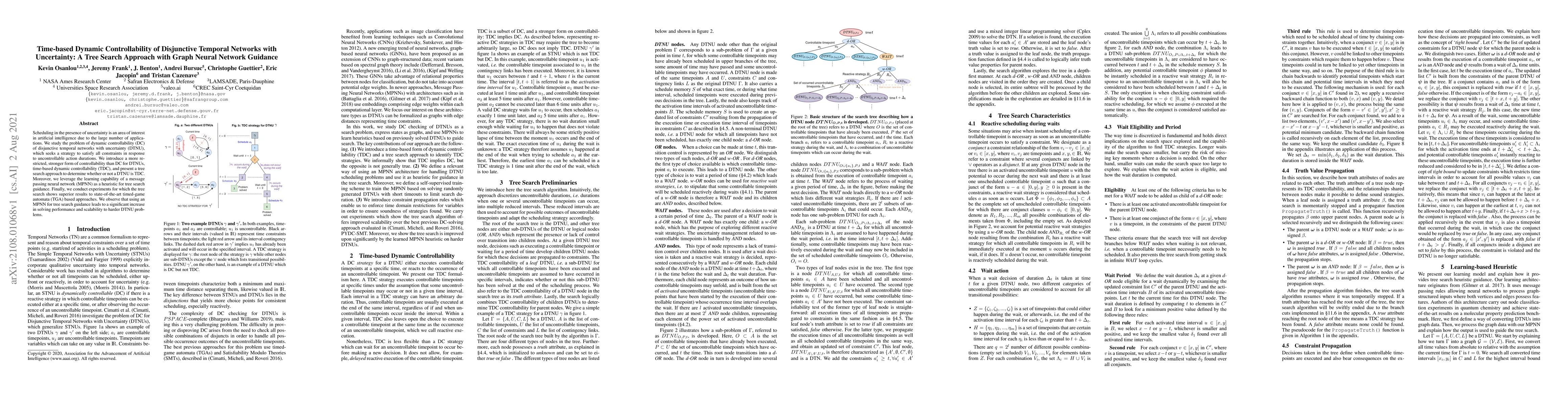 Scheduling in the presence of uncertainty is an area of interest in artificial intelligence due to the large number of applications. We study the problem of dynamic controllability (DC) of disjunctive temporal networks with uncertainty (DTNU), which seeks a strategy to satisfy all constraints in response to uncontrollable action durations. We introduce a more restricted, stronger form of controllability than DC for DTNUs, time-based dynamic controllability (TDC), and present a tree search approach to determine whether or not a DTNU is TDC. Moreover, we leverage the learning capability of a message passing neural network (MPNN) as a heuristic for tree search guidance. Finally, we conduct experiments for which the tree search shows superior results to state-of-the-art timed-game automata (TGA) based approaches. We observe that using an MPNN for tree search guidance leads to a significant increase in solving performance and scalability to harder DTNU problems.