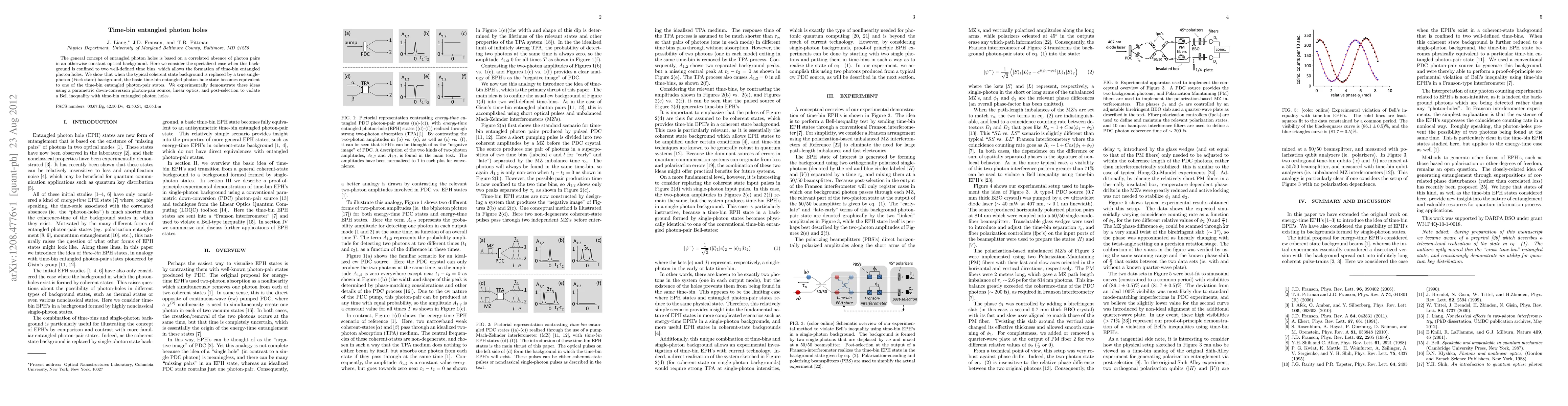 This paper explores time-bin entangled photon holes, which are correlated absences of photon pairs in a time-bin structured optical background. The study demonstrates that replacing a coherent state with a single-photon Fock state transforms these holes into time-bin entangled photon-pair states, validated by experimental violation of a Bell inequality using parametric down-conversion and post-selection.