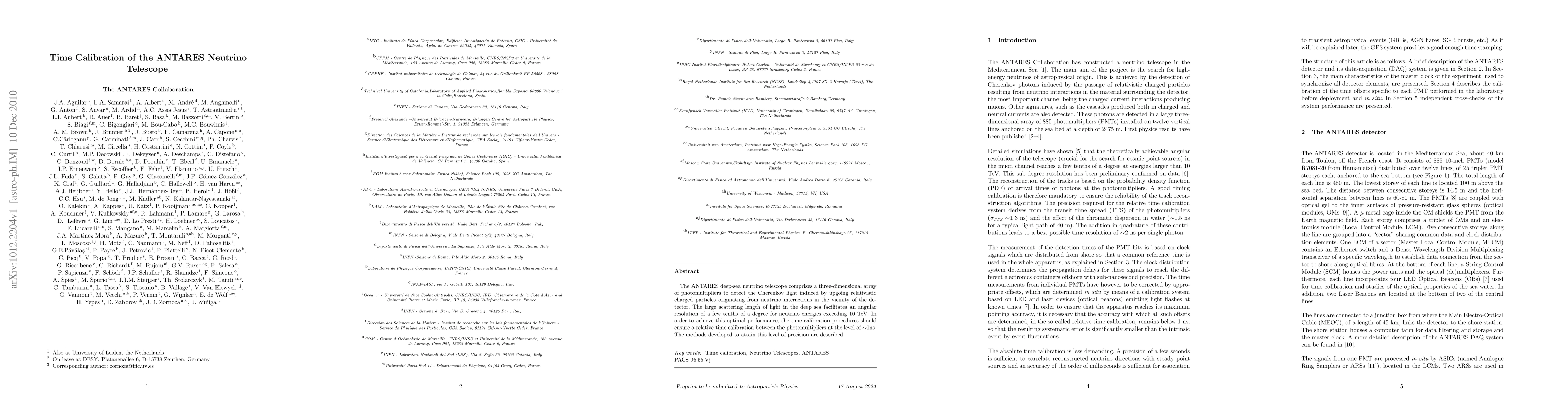 The paper presents detailed methods and results for the time calibration of the ANTARES neutrino telescope, including onshore and in-situ calibration techniques, optical beacon systems, and validation using potassium-40 decays.