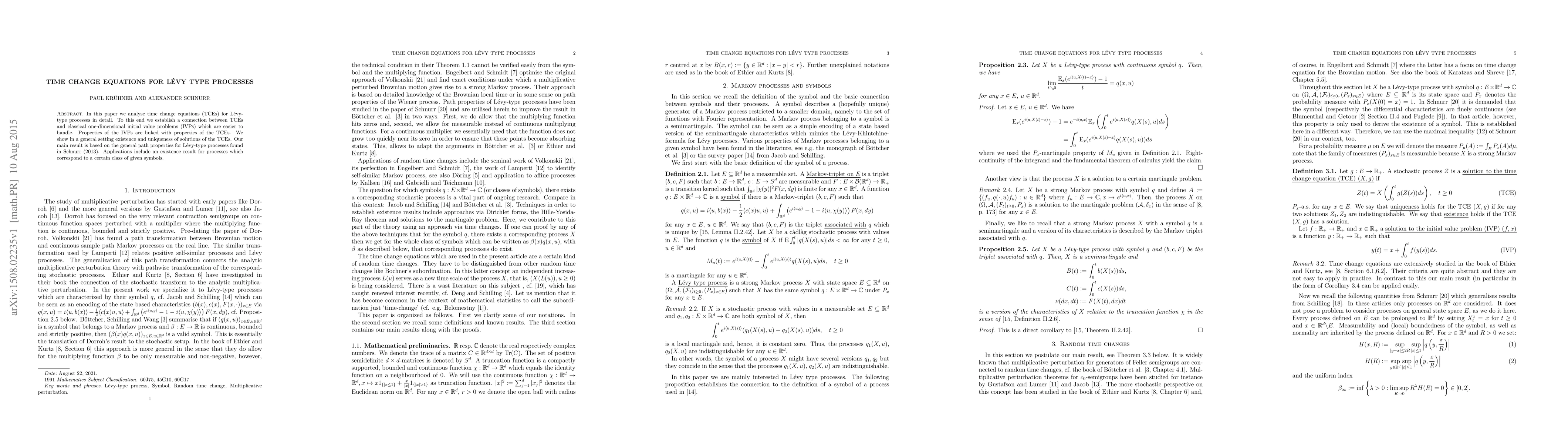 This paper explores time change equations (TCEs) for Lévy-type processes, linking them to classical one-dimensional initial value problems (IVPs) for easier analysis. The study establishes existence and uniqueness of solutions for TCEs, grounded in the path properties of Lévy-type processes, with applications to processes corresponding to a specific class of symbols.