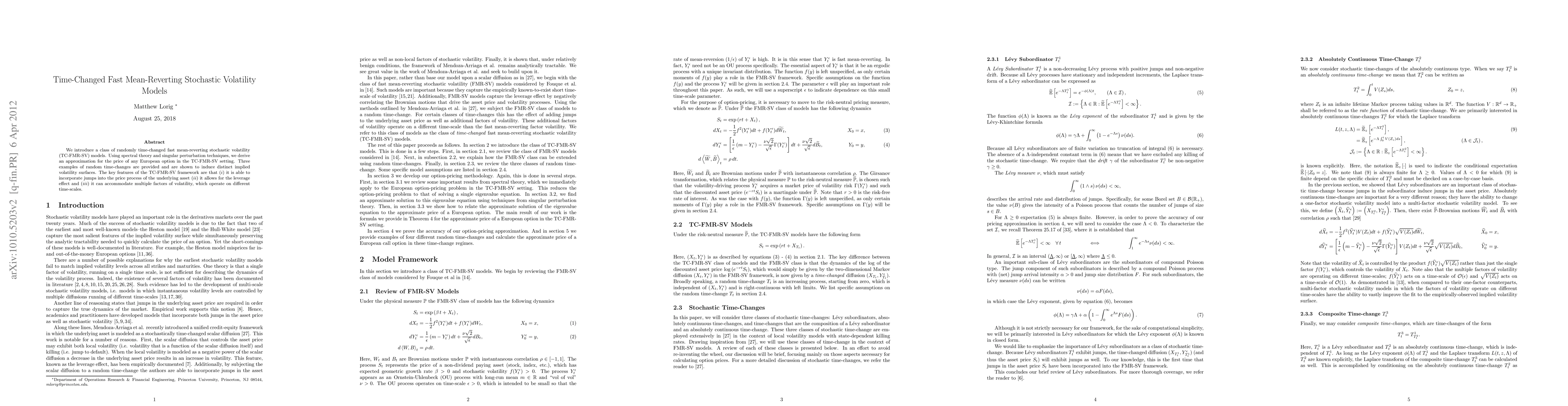 This paper introduces time-changed fast mean-reverting stochastic volatility models, incorporating jumps, leverage effects, and multiple volatility factors. It uses spectral theory and singular perturbation techniques to derive an approximation for European option prices and examines the resulting implied volatility surfaces.