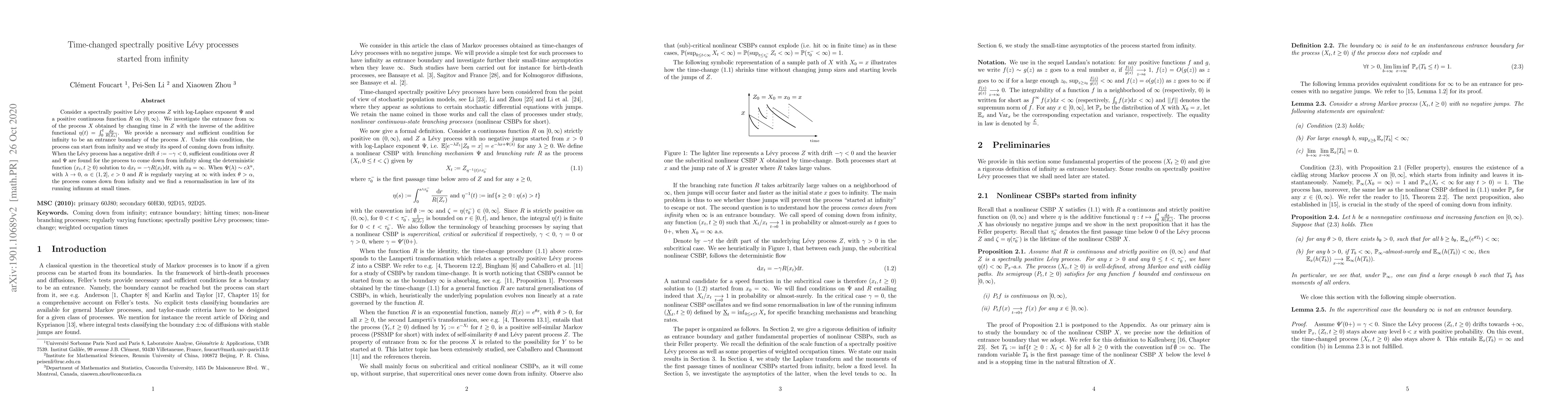 Consider a spectrally positive L\'evy process $Z$ with log-Laplace exponent $\Psi$ and a positive continuous function $R$ on $(0,\infty)$. We investigate the entrance from $\infty$ of the process $X$ obtained by changing time in $Z$ with the inverse of the additive functional $\eta(t)=\int_{0}^{t}\frac{{\rm d} s}{R(Z_s)}$. We provide a necessary and sufficient condition for infinity to be an entrance boundary of the process $X$. Under this condition, the process can start from infinity and we study its speed of coming down from infinity. When the L\'evy process has a negative drift $\delta:=-\gamma<0$, sufficient conditions over $R$ and $\Psi$ are found for the process to come down from infinity along the deterministic function $(x_t,t\geq 0)$ solution to ${\rm d} x_t=-\gamma R(x_t) {\rm d} t$, with $x_0=\infty$. When $\Psi(\lambda)\sim c\lambda^{\alpha}$, with $\lambda \rightarrow 0$, $\alpha\in (1,2]$, $c>0$ and $R$ is regularly varying at $\infty$ with index $\theta>\alpha$, the process comes down from infinity and we find a renormalisation in law of its running infimum at small times.