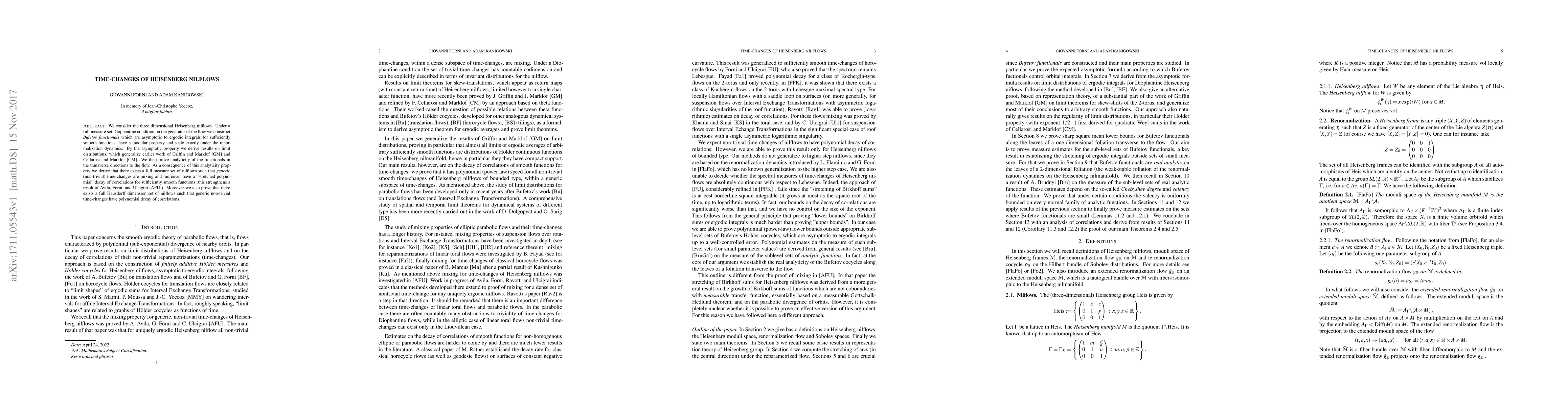 We consider the three dimensional Heisenberg nilflows. Under a full measure set Diophantine condition on the generator of the flow we construct Bufetov functionals which are asymptotic to ergodic integrals for sufficiently smooth functions, have a modular property and scale exactly under the renor- malization dynamics. We then prove analyticity of the functionals in the transverse directions to the flow. As a consequence of this analyticity property we derive that there exists a full measure set of nilflows such that generic (non-trivial) time-changes are mixing and moreover have a "stretched polynomial" decay of correlations for sufficiently smooth functions. Moreover we also prove that there exists a full Hausdorff dimension set of nilflows such that generic non-trivial time-changes have polynomial decay of correlations.