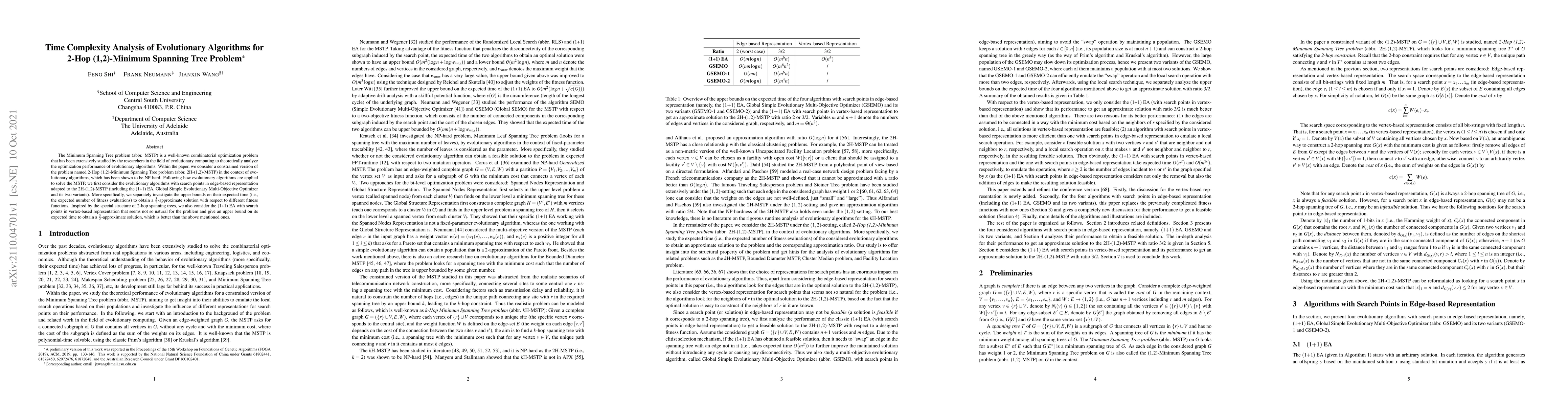 The Minimum Spanning Tree problem (abbr. MSTP) is a well-known combinatorial optimization problem that has been extensively studied by the researchers in the field of evolutionary computing to theoretically analyze the optimization performance of evolutionary algorithms. Within the paper, we consider a constrained version of the problem named 2-Hop (1,2)-Minimum Spanning Tree problem (abbr. 2H-(1,2)-MSTP) in the context of evolutionary algorithms, which has been shown to be NP-hard. Following how evolutionary algorithms are applied to solve the MSTP, we first consider the evolutionary algorithms with search points in edge-based representation adapted to the 2H-(1,2)-MSTP (including the (1+1) EA, Global Simple Evolutionary Multi-Objective Optimizer and its two variants). More specifically, we separately investigate the upper bounds on their expected time (i.e., the expected number of fitness evaluations) to obtain a $\frac{3}{2}$-approximate solution with respect to different fitness functions. Inspired by the special structure of 2-hop spanning trees, we also consider the (1+1) EA with search points in vertex-based representation that seems not so natural for the problem and give an upper bound on its expected time to obtain a $\frac{3}{2}$-approximate solution, which is better than the above mentioned ones.