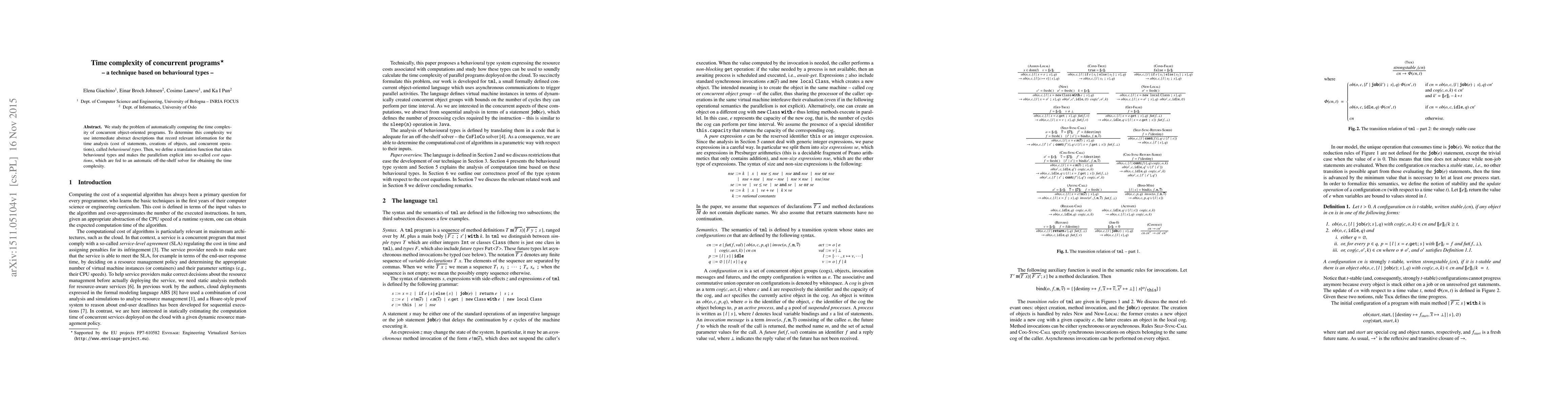 This paper investigates the automatic computation of time complexity for concurrent object-oriented programs using behavioral types to capture relevant time-related information. It translates these types into cost equations for an off-the-shelf solver to determine the overall time complexity.
